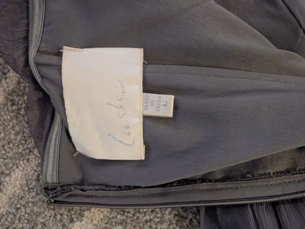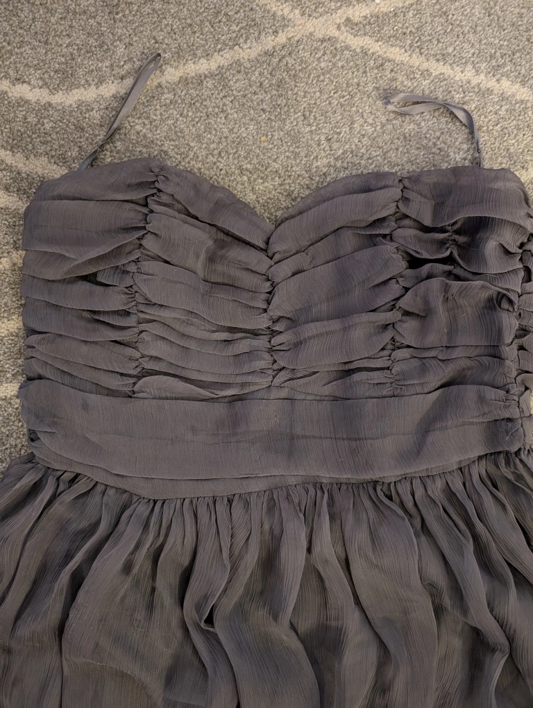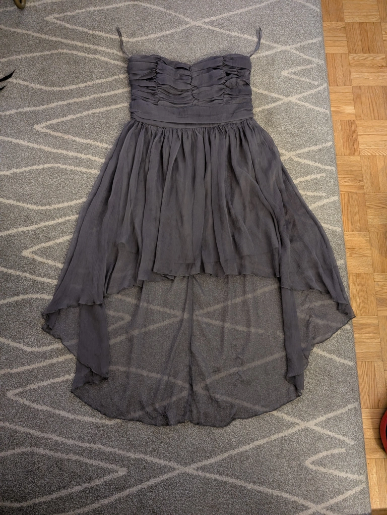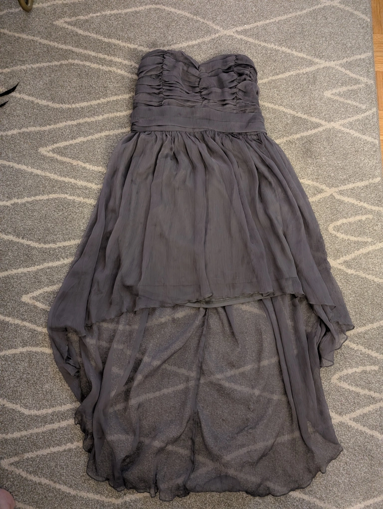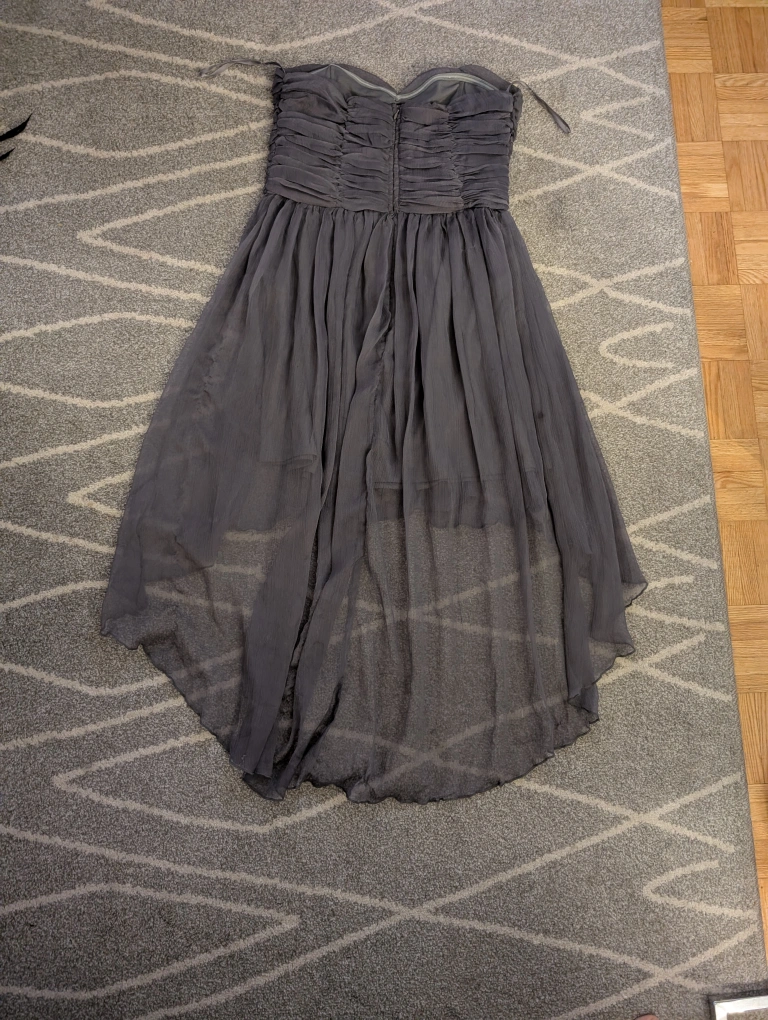 Here's a lovely Lulus strapless dress in a beautiful gray colour! It's a size large (for someone 11 to 18 years oldish) and features a stylish hi-lo hemline. Perfect for a special occasion or a night out. Only worn once.
