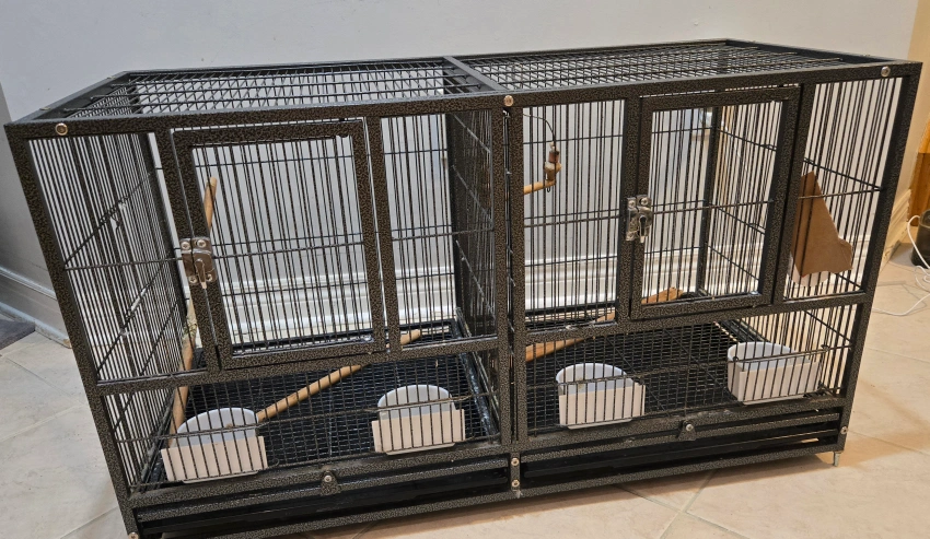 Selling a large double bird cage, perfect for multiple birds or giving your feathered friend plenty of space. It's in good condition and ready for a new home. It does not come with the stand . It is as attached in the picture come with trays and bird feeding containers.