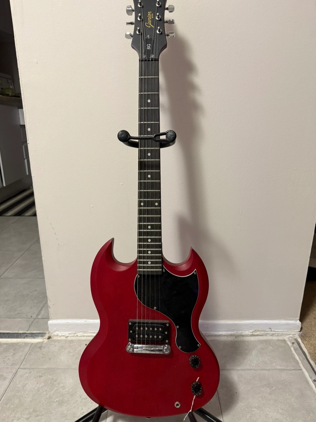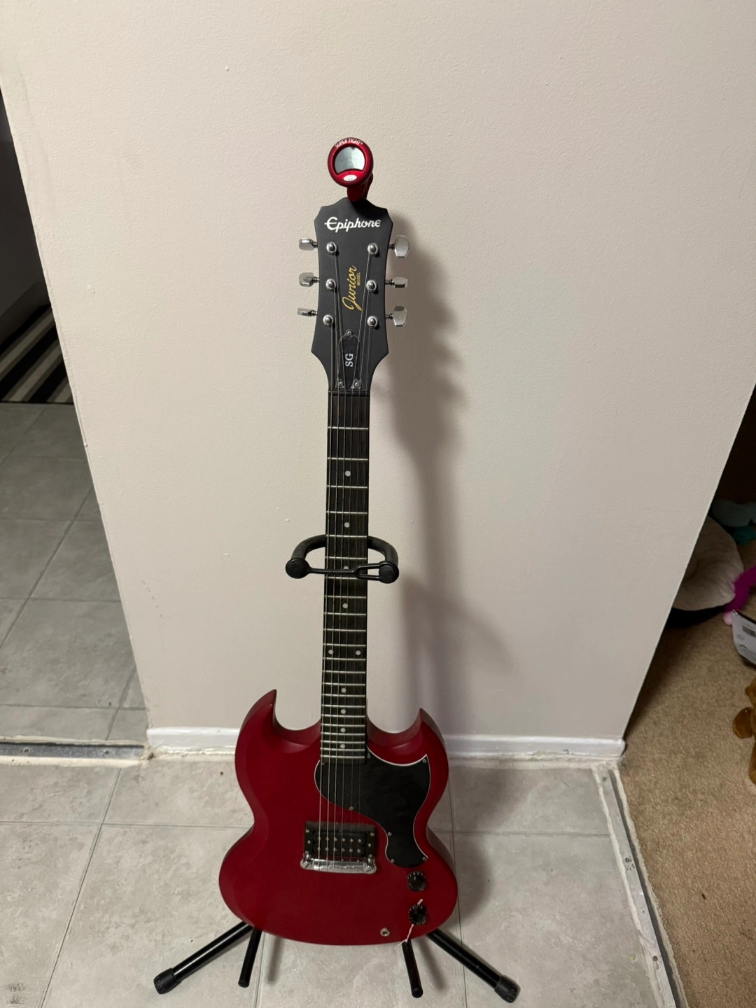 I’m selling my red Epiphone SG Electric Guitar along with my electric tuner and guitar stand. I’m asking for $300 as an Epiphone SG can range from $300 - $900 and it comes with a working tuner and stand.