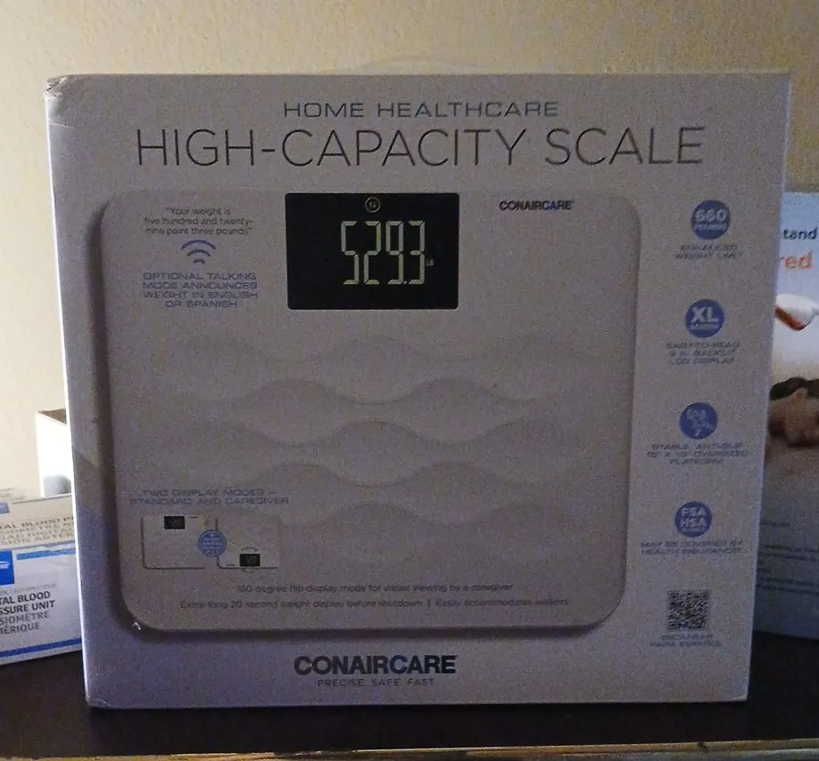 Selling a ConairCare high-capacity scale! It features an optional talking mode that announces the weight in English or Spanish. The scale has two display modes, standard and caregiver, and a 180-degree flip display mode for easier viewing. It also has an extra-long 20-second weight display before shutdown and easily accommodates walk-ins. The scale has a 660-pound weight limit and a stable, anti-slip 12" x 12" cushioned platform