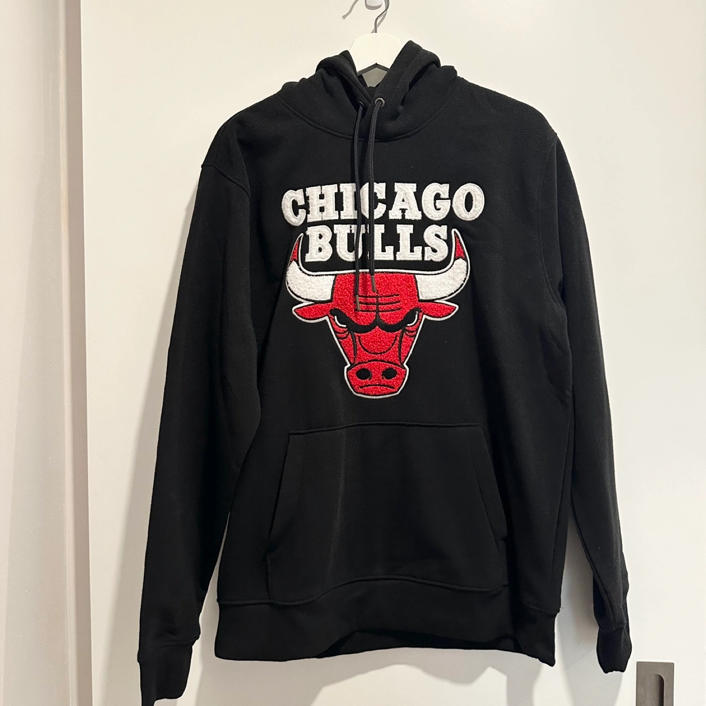 Selling a Chicago Bulls hoodie in size L/G. It's a black hoodie with the iconic Bulls logo on the front.