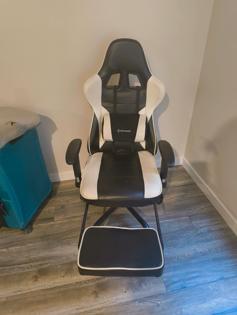 Selling a Von Racer gaming chair in black and white. It's in decent condition, the wheels are a bit stuck but otherwise functional and ready for a new home. Perfect for gaming or working from home!