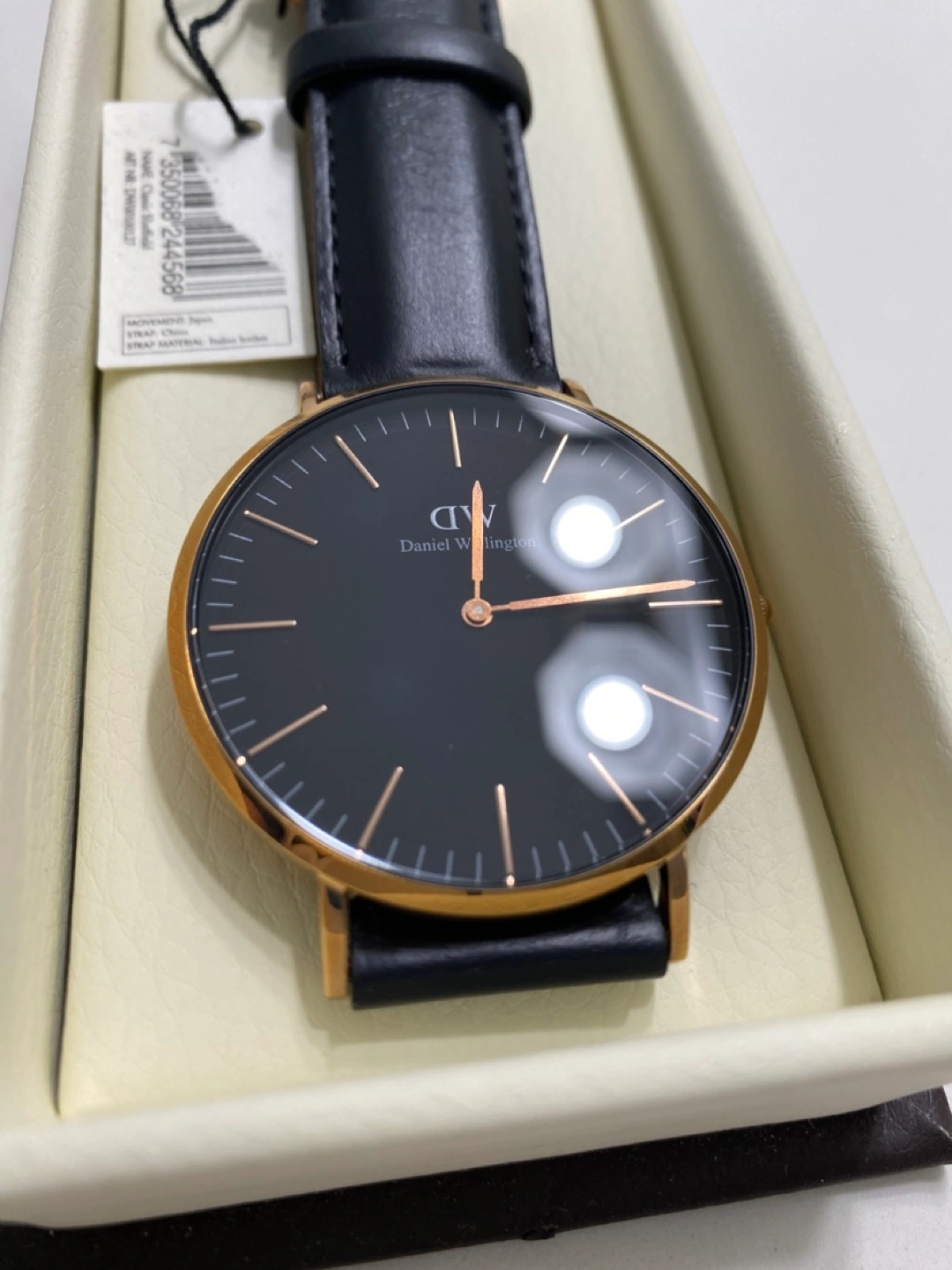 Stylish Daniel Wellington Watch - rose gold with black leather straps. New in box. Please see picture 3 - there are some surface cracks on one of the leather straps. I have also included a picture of the other strap that is smooth with no cracks. You will have to replace the batteries. Pick up around McCowan and Alton Towers area. Cash only.