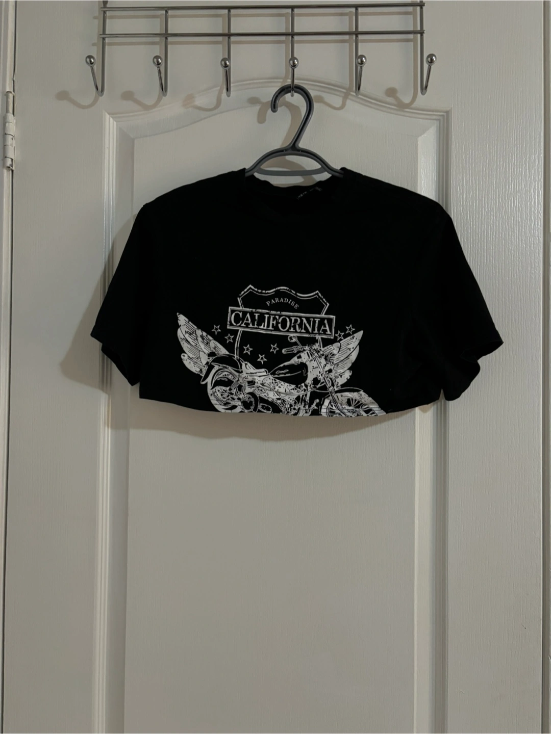 10Selling a cute black crop top! It features a motorcycle and California design on the front. In great condition and ready for a new home!