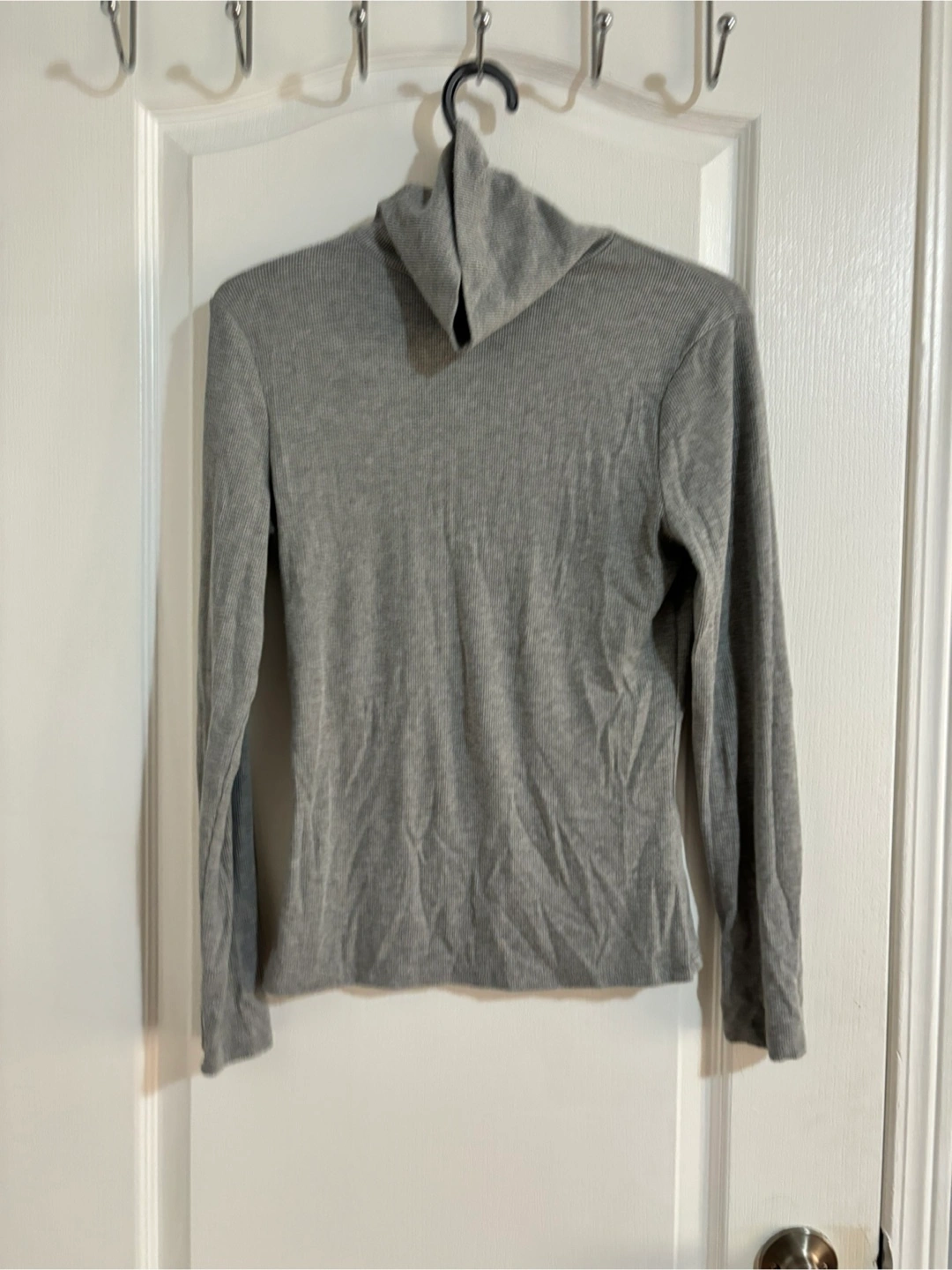 10Selling a comfy grey turtleneck long sleeve top! It's in great condition and perfect for layering during the cooler months. The material is soft and stretchy, making it a cozy addition to any wardrobe