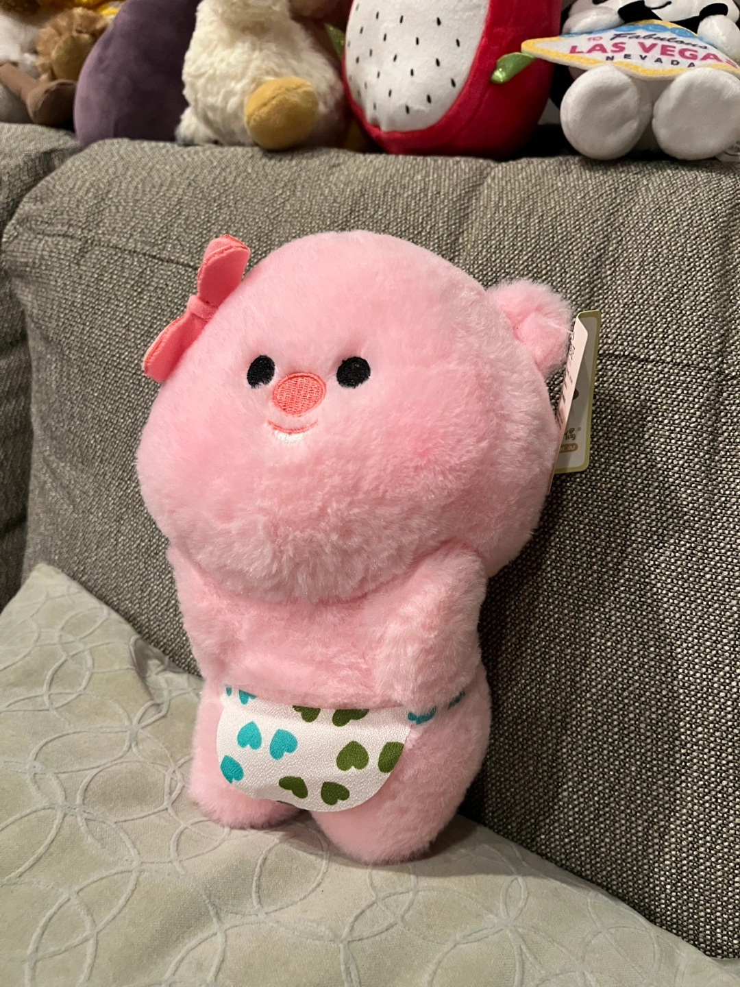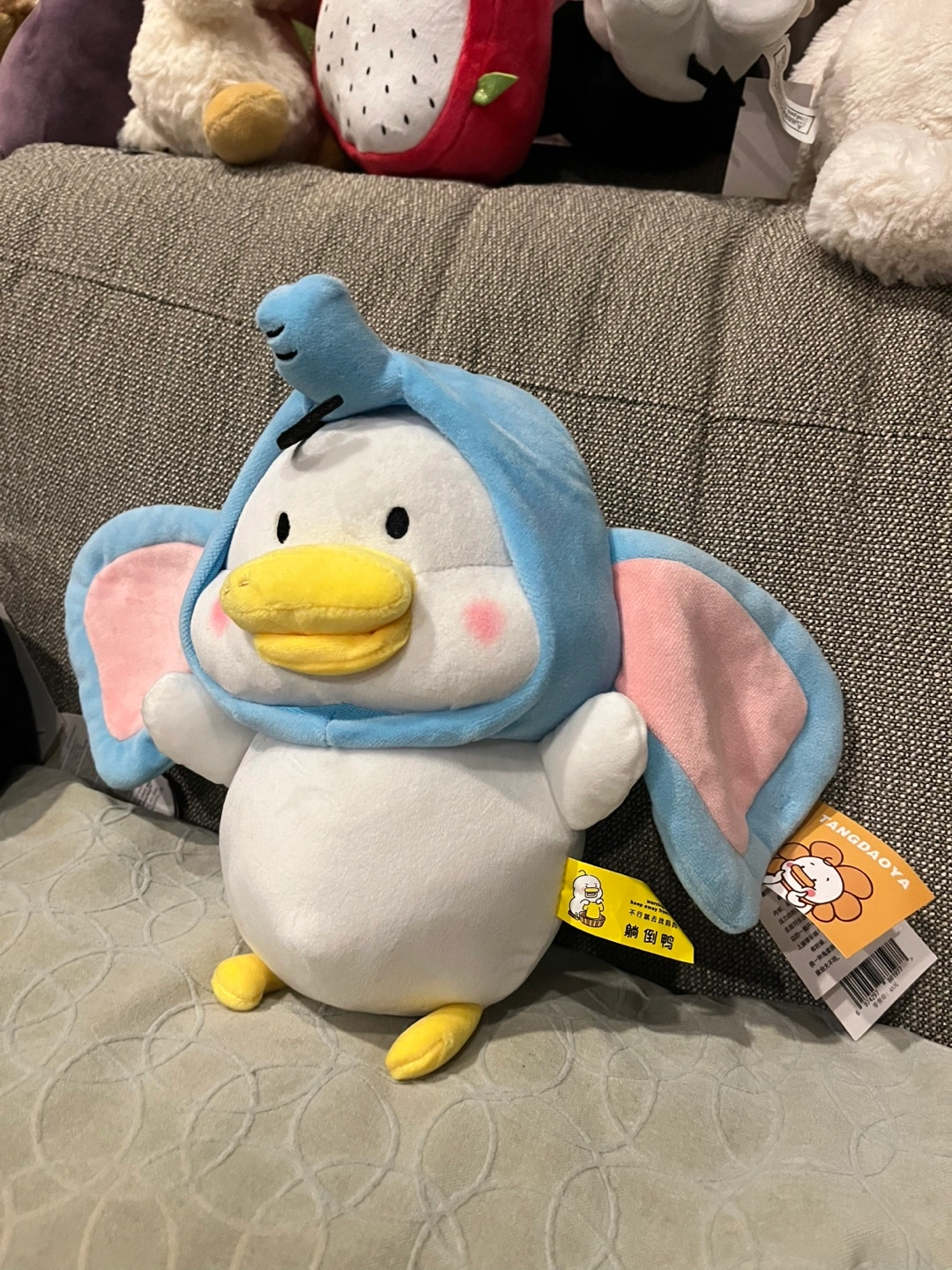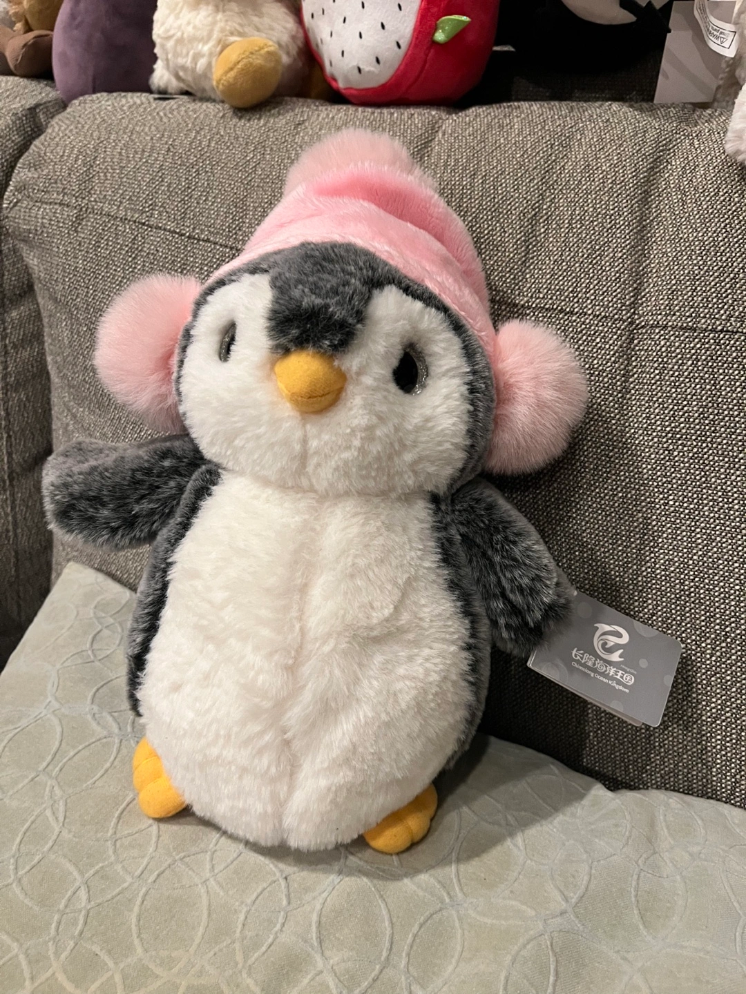 Selling these adorable plush toys! They're in great condition and ready for a new home. Perfect for kids or collectors. The penguin has a cute pink hat, the pig is a lovely pink, and the duck has a blue elephant costume!