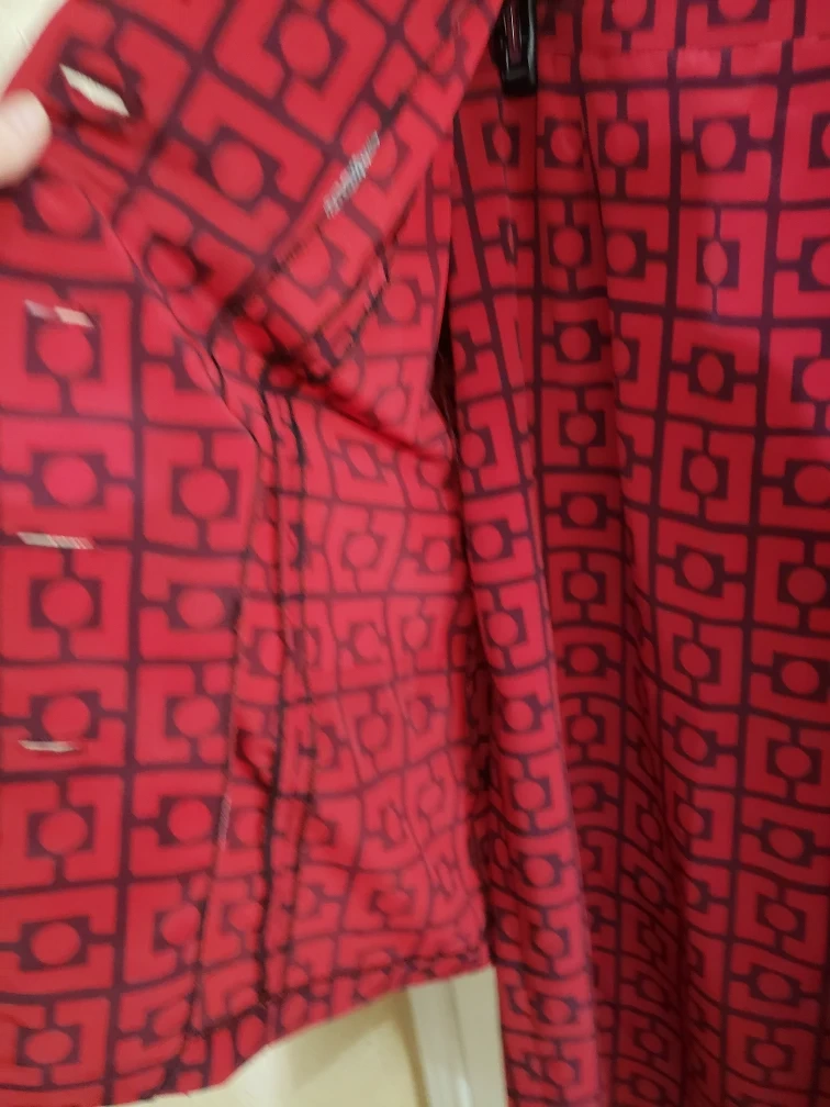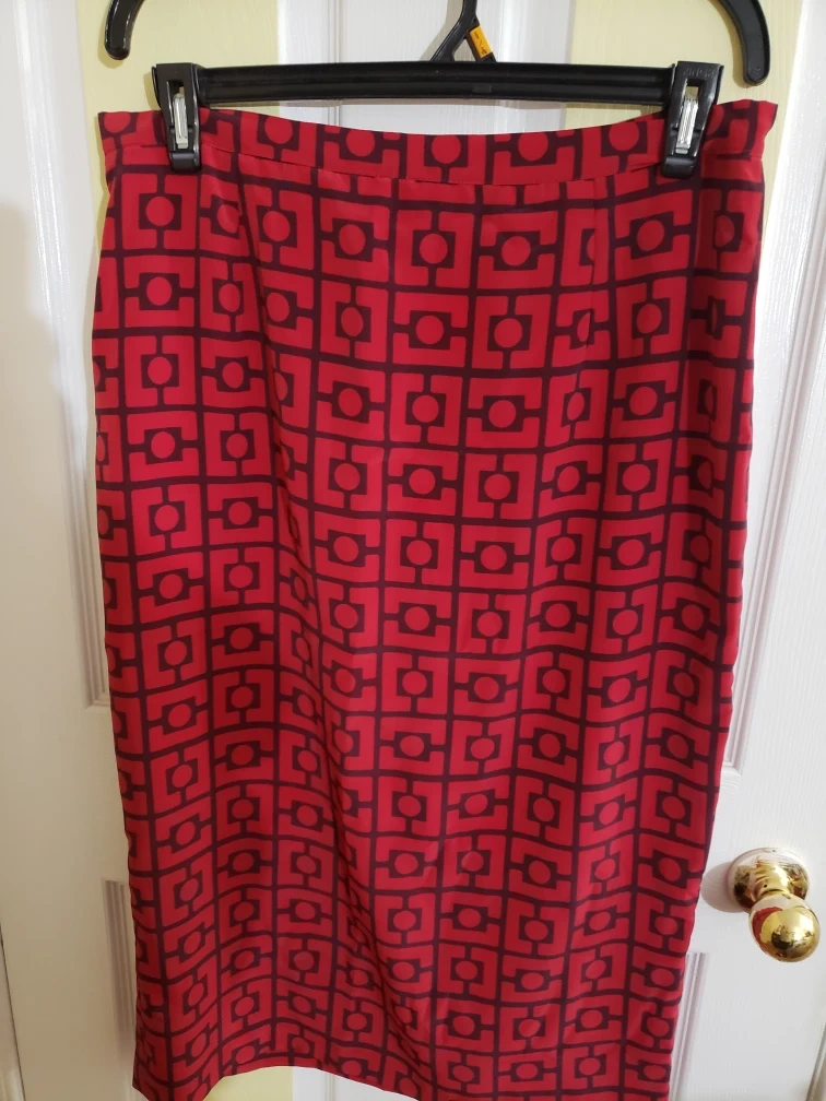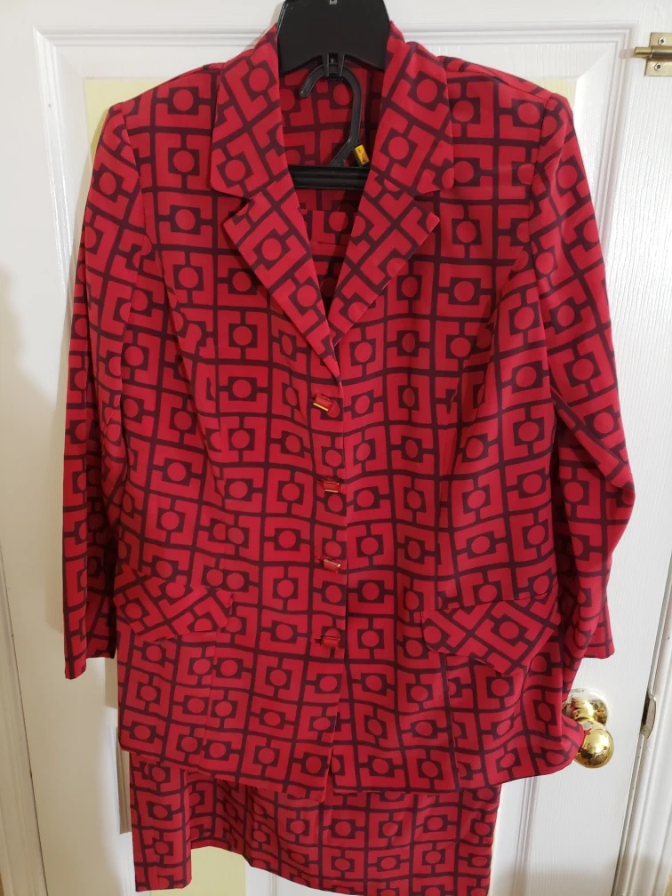 130This is a striking red and black skirt suit. It features a unique geometric pattern. The suit includes a blazer and a skirt. Perfect for making a statement!