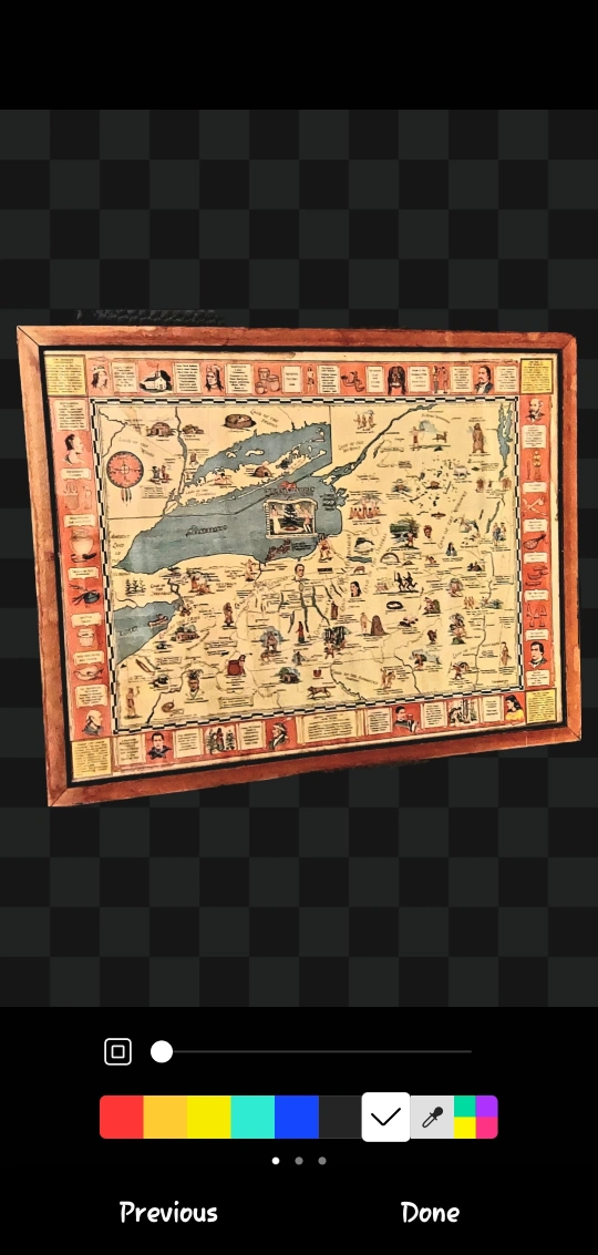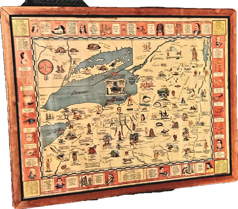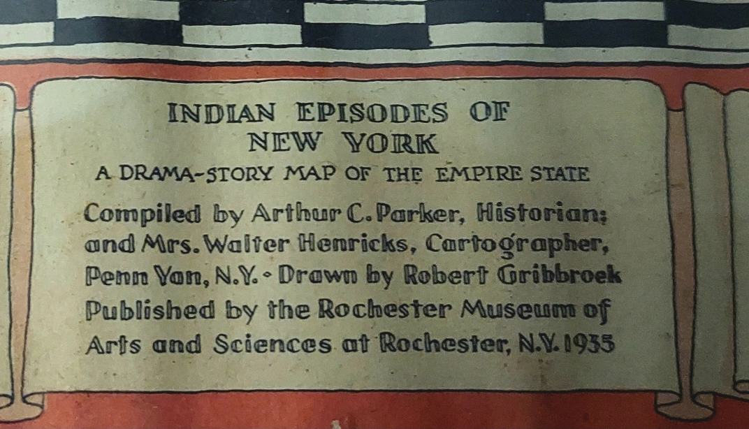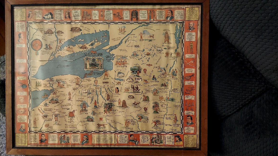 Selling a vintage map titled "Indian Episodes of New York: A Drama-Story Map of the Empire State." It was compiled by Arthur C. Parker, Historian, and Mrs. Walter Henricks, Cartographer, and drawn by Robert Gribbroek. Published by the Rochester Museum of Arts and Sciences in 1935. The frame measures 24 x 26 inches.