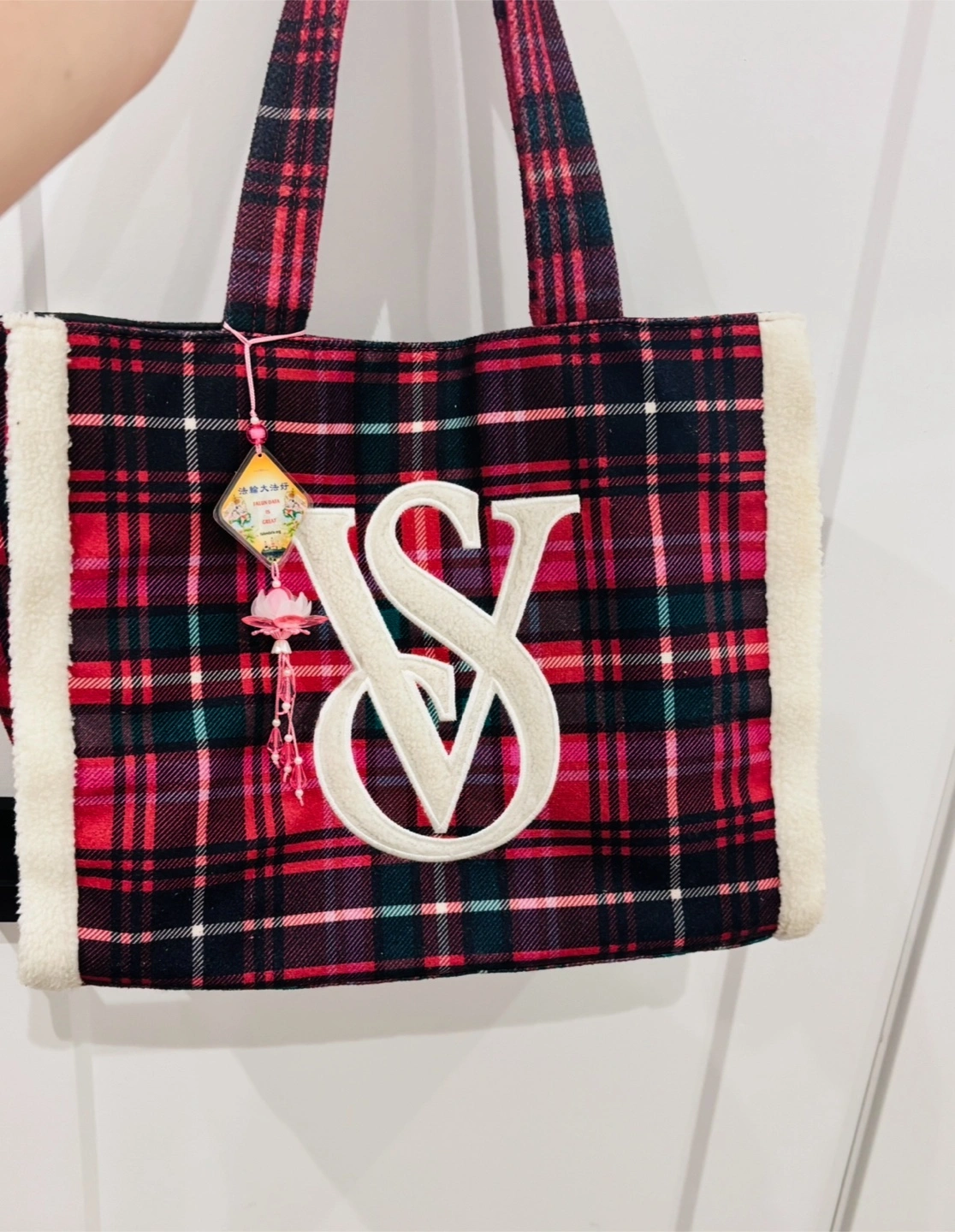 Here's a Victoria's Secret tote bag that's in great shape! It features a vibrant plaid pattern and a soft, fluffy trim. Perfect for carrying your essentials in style