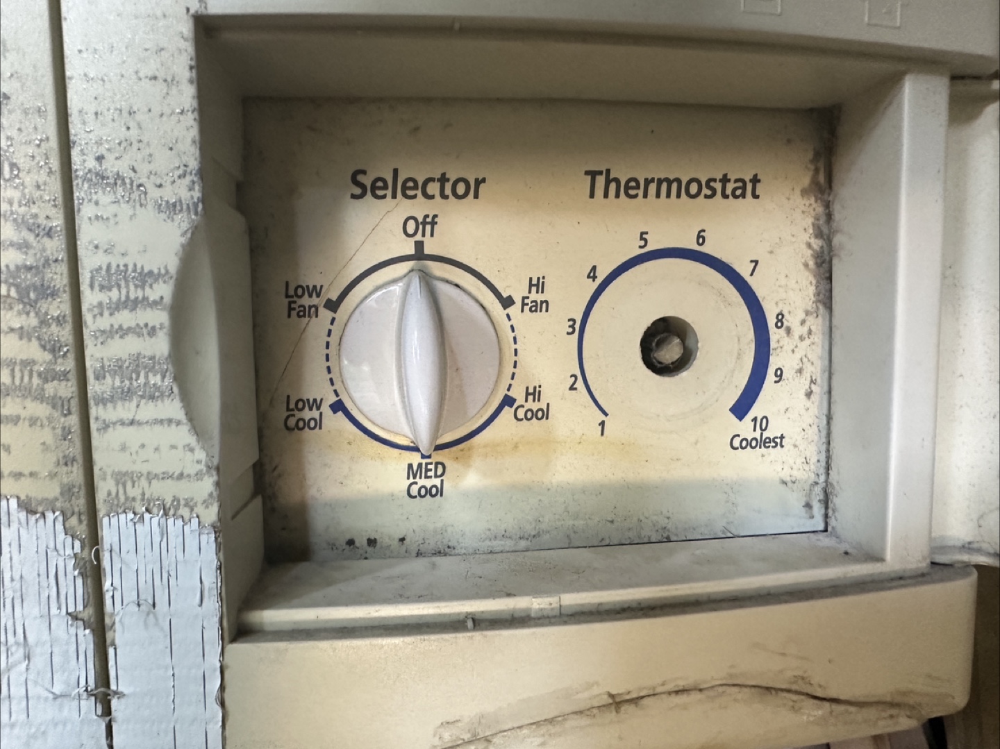 It fits window openings at least 21 inches wide and needs a window opening of 14.5 inches high. It has a selector for fan and cool settings, and a thermostat dial to adjust the coolness level. Note one of the dials is missing - but can be adjusted with a pair of pliers.