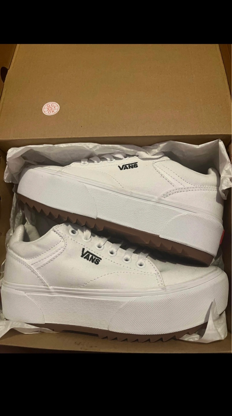 Selling a pair of Vans platform sneakers in white! They come in the original box. Size is not indicated on the box or shoe.