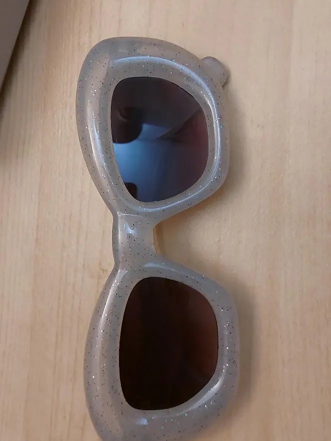 Selling a pair of grey sunglasses with a glittery finish. They have a unique, rounded frame design.