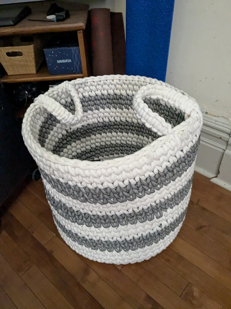 Selling a lovely large basket! It's a stylish way to store items around your home. The basket features a grey and white pattern and has convenient handles for easy carrying. Cash payment.