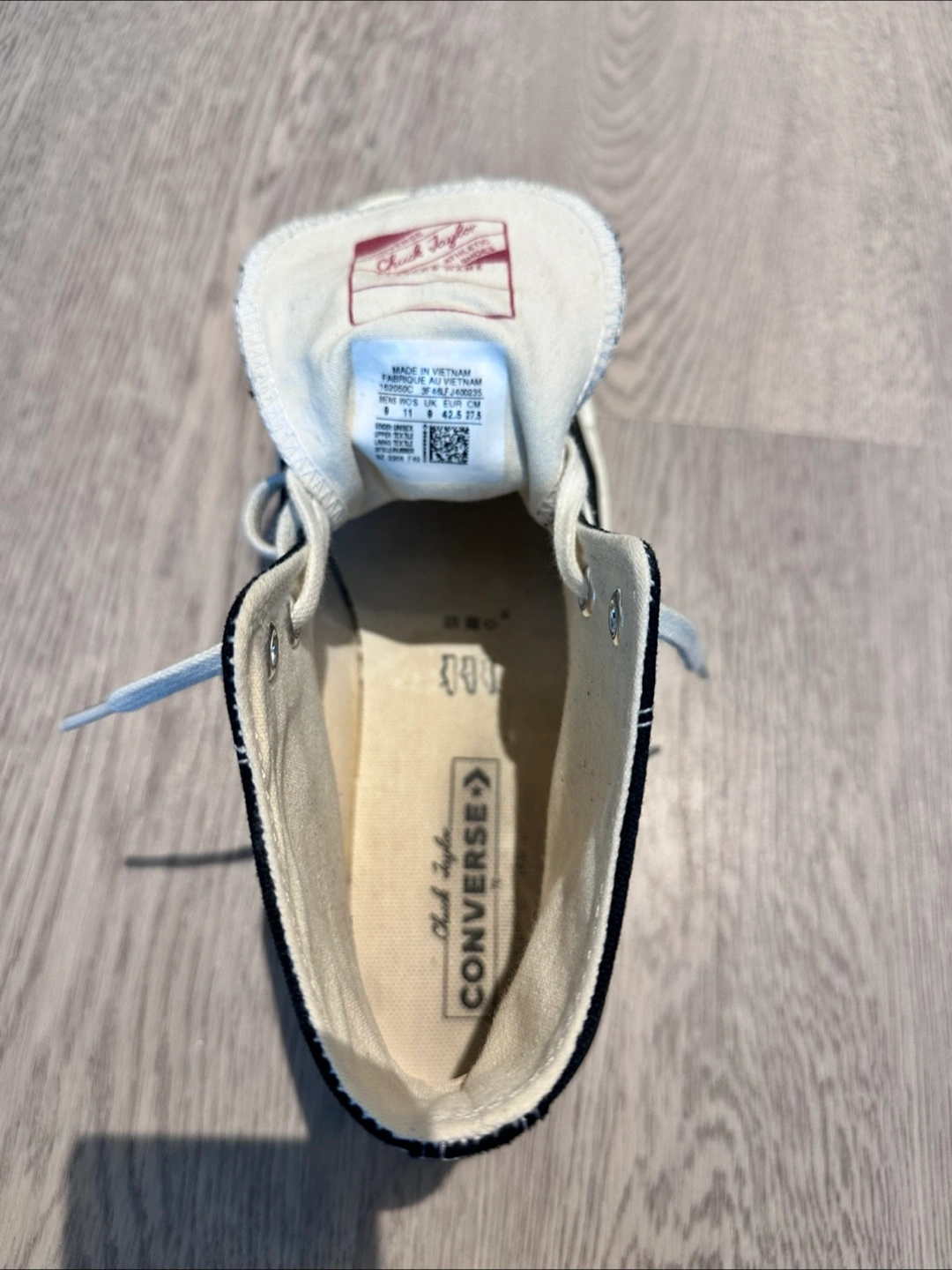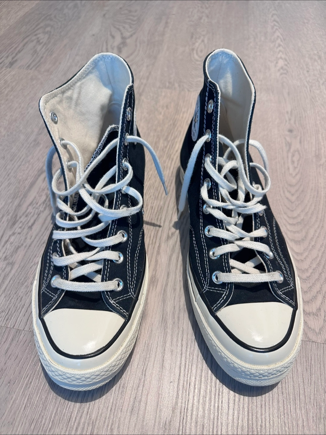 Classic Converse Chuck Taylor All Star high tops in black and white! These iconic sneakers are in great shape and ready for a new home. Perfect for adding a touch of retro style to any outfit. 9 US men size. I usually wear 9.5. This fits me perfectly.