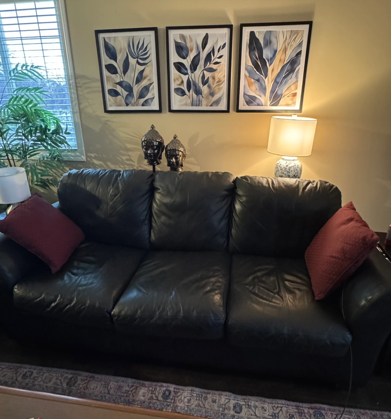 Selling a comfortable black leather three-seater sofa. It's in good condition and would be a great addition to any living room! There are some signs of wear, but it's still very functional and stylish