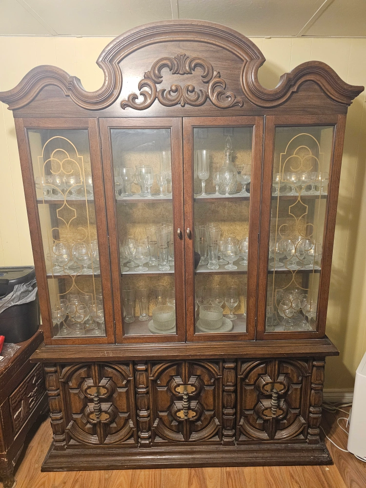 Selling a vintage wood china cabinet. It has a beautiful, ornate design and plenty of space for displaying your favourite dishes and glassware. It's in good condition and ready to add a touch of elegance to your home