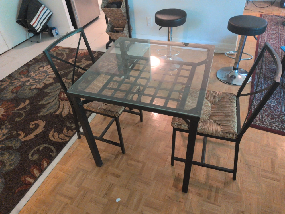 Selling a dining table with a glass top and two matching chairs. The chairs have woven seats and the table and chairs have a dark metal frame. It's a great set for a small dining area or kitchen nook!