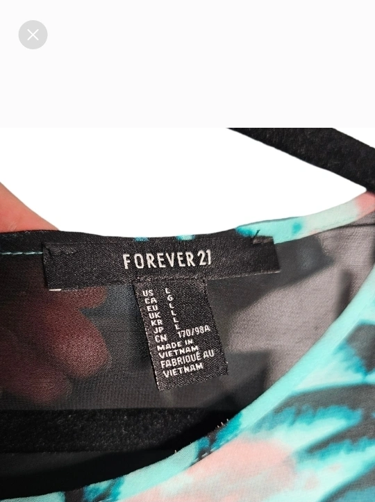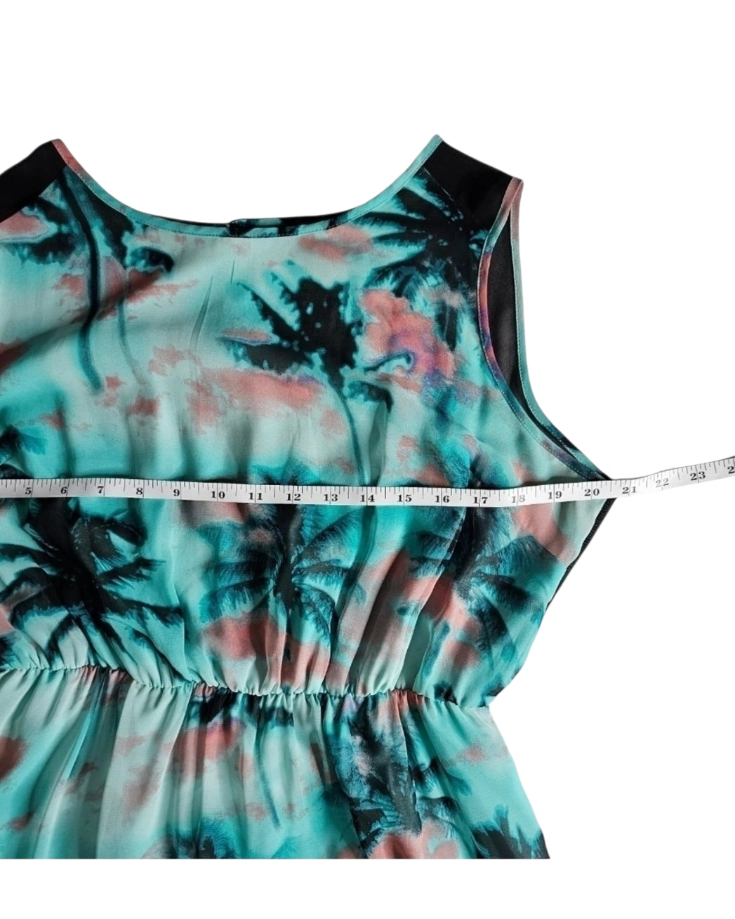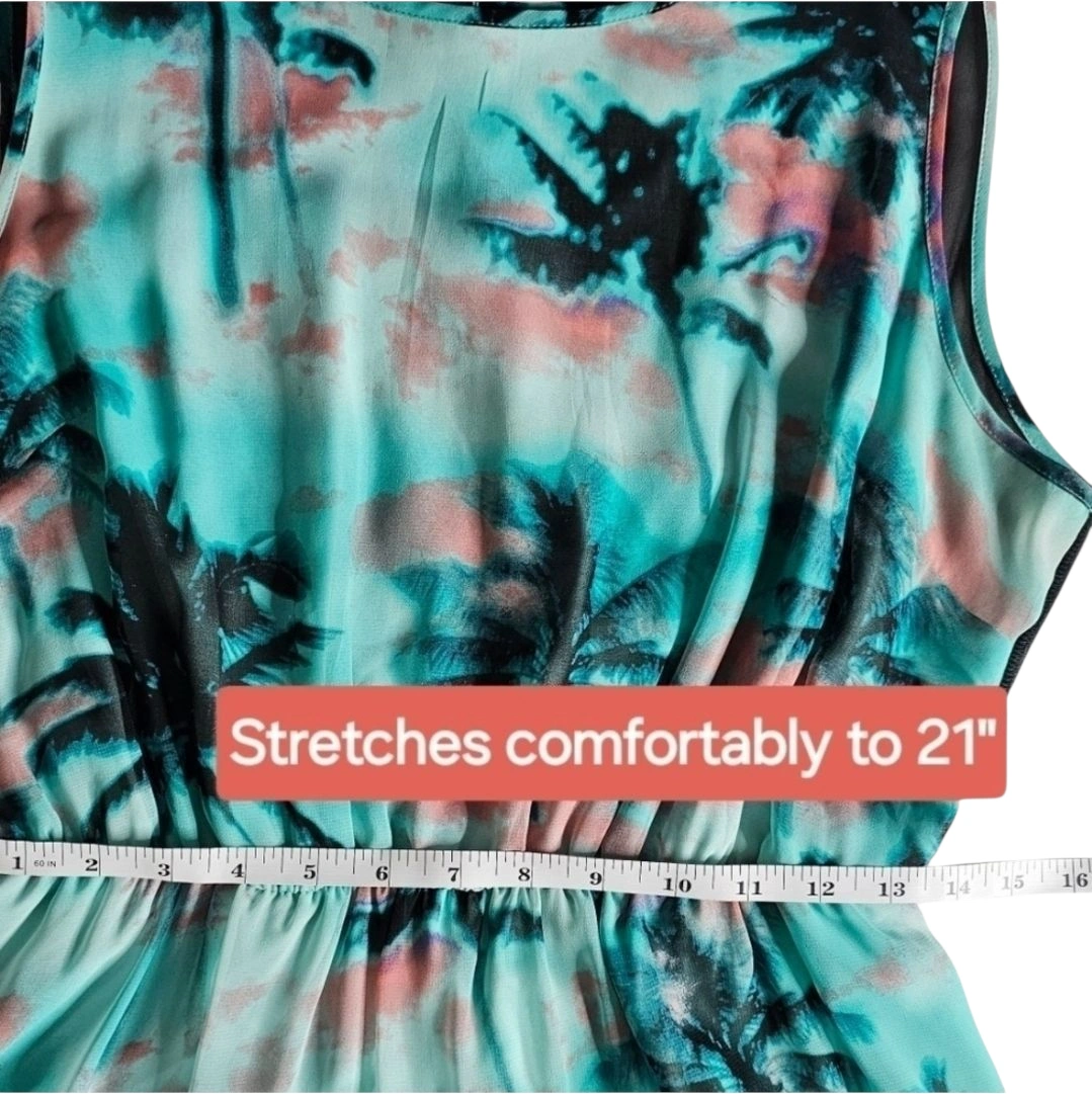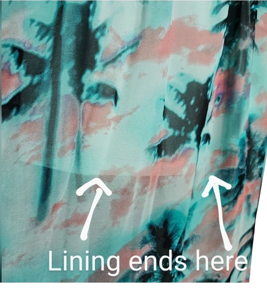 This maxi dress features a beautiful palm print design. It has a sheer black top in the back and a flowing skirt with a lining that ends partway down.