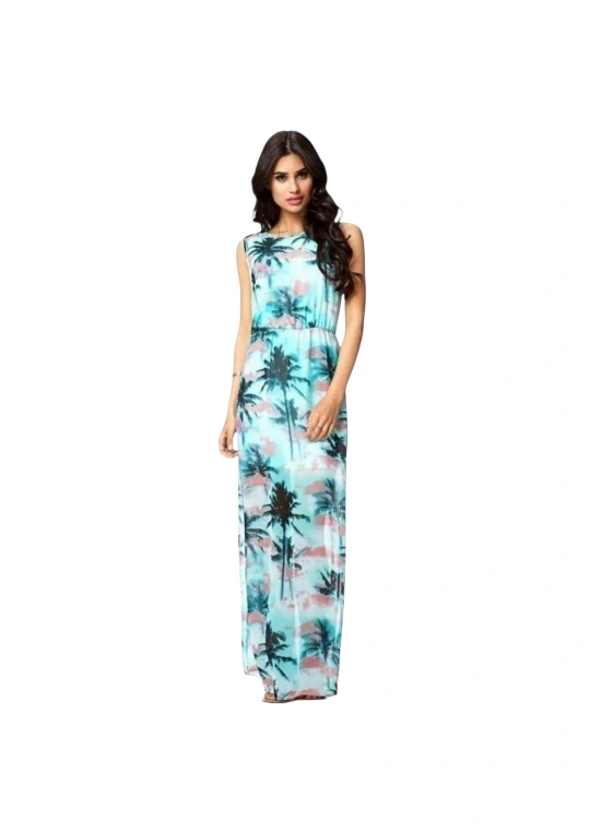 Turquoise Tropical Print Sleeveless Maxi Dress