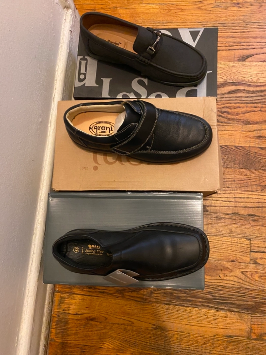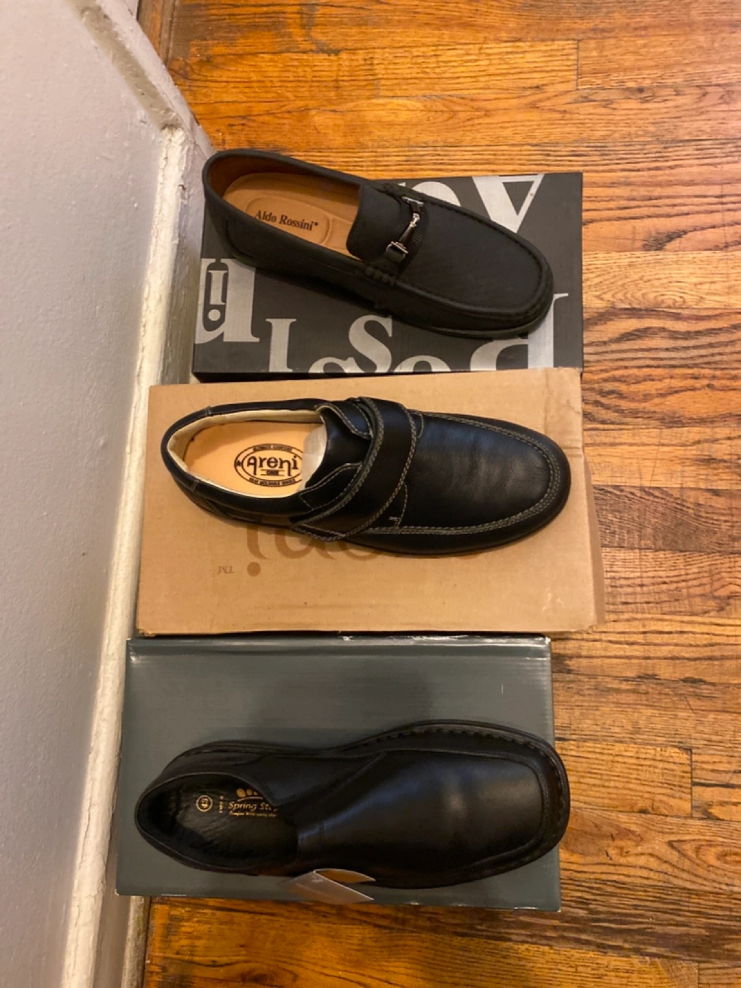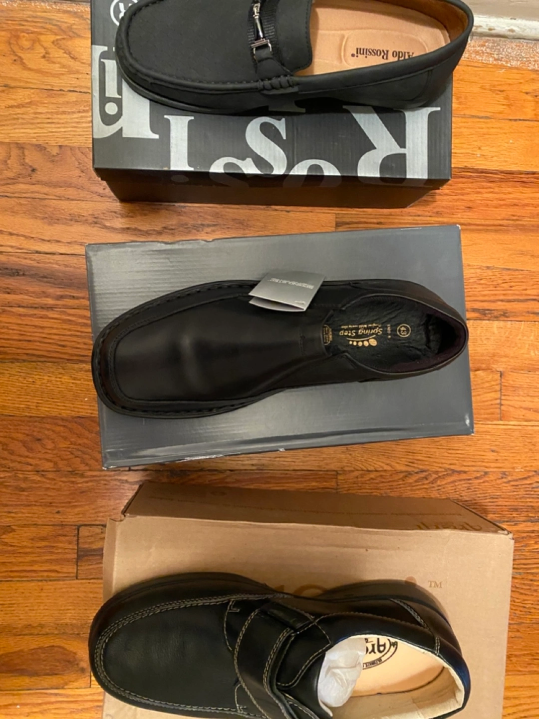 Selling three pairs of men's shoes in size 10. You'll get an Aldo Rossini pair, a Spring Step pair, and a pair from Arena. All come with their original boxes!