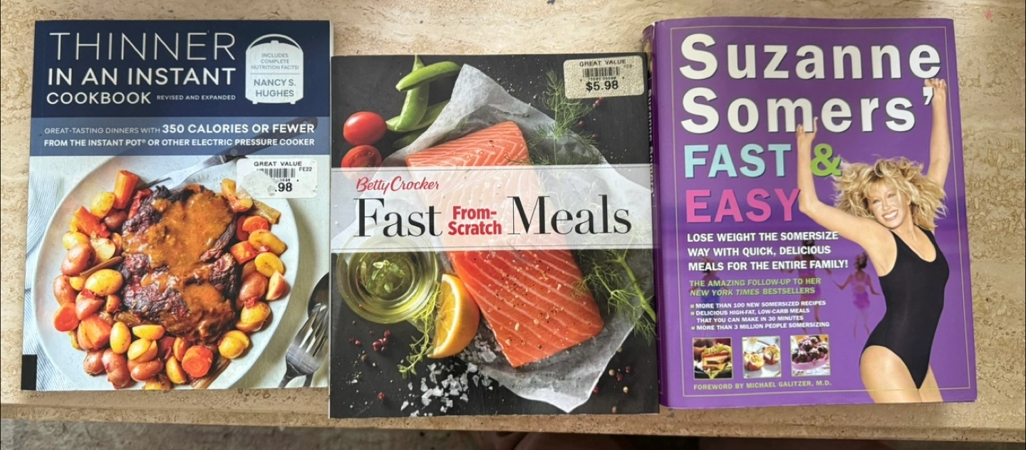 Selling a set of three cookbooks! Includes: - Thinner in an Instant Cookbook by Nancy S. Hughes: Great-tasting dinners with 350 calories or fewer from the Instant Pot or other electric pressure cooker - Betty Crocker Fast From-Scratch Meals - Suzanne Somers' Fast & Easy: Lose weight the Somersize way with quick, delicious meals for the entire family