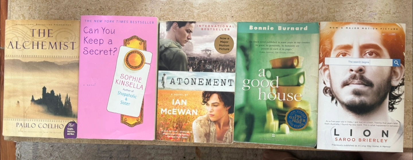 90Selling a collection of six books, including: - The Alchemist by Paulo Coelho - Can You Keep a Secret? by Sophie Kinsella - Atonement by Ian McEwan - A Good House by Bonnie Burnard - Lion by Saroo Brierley