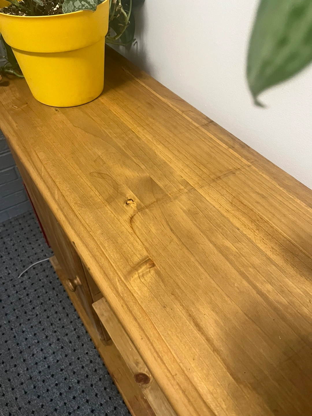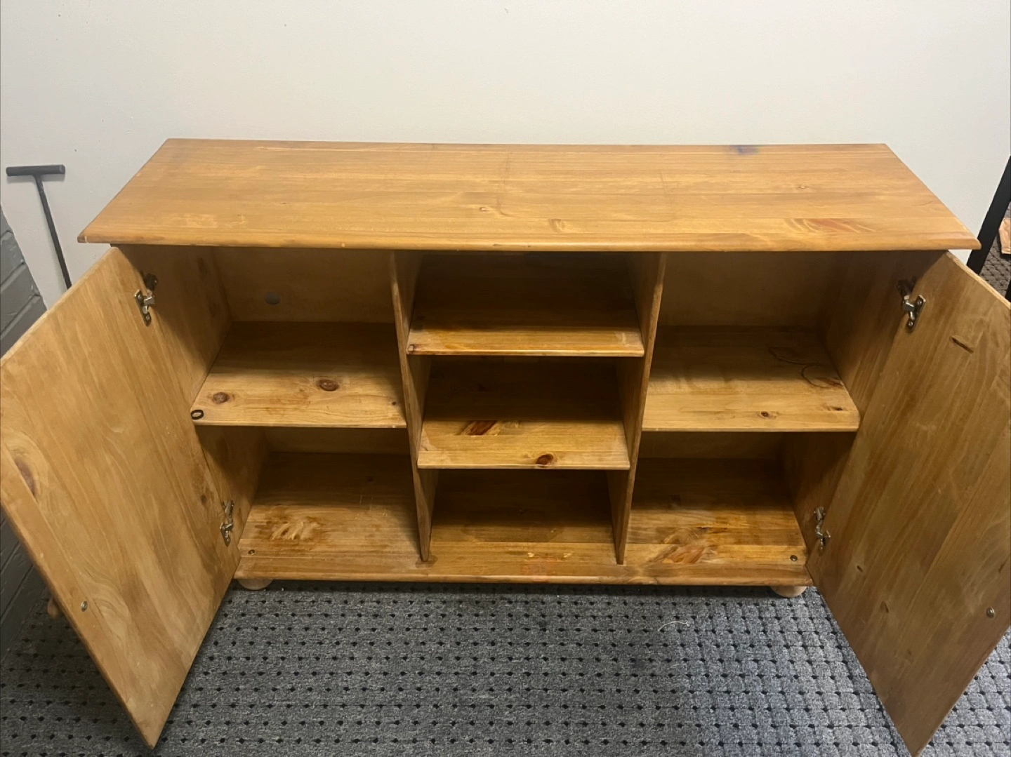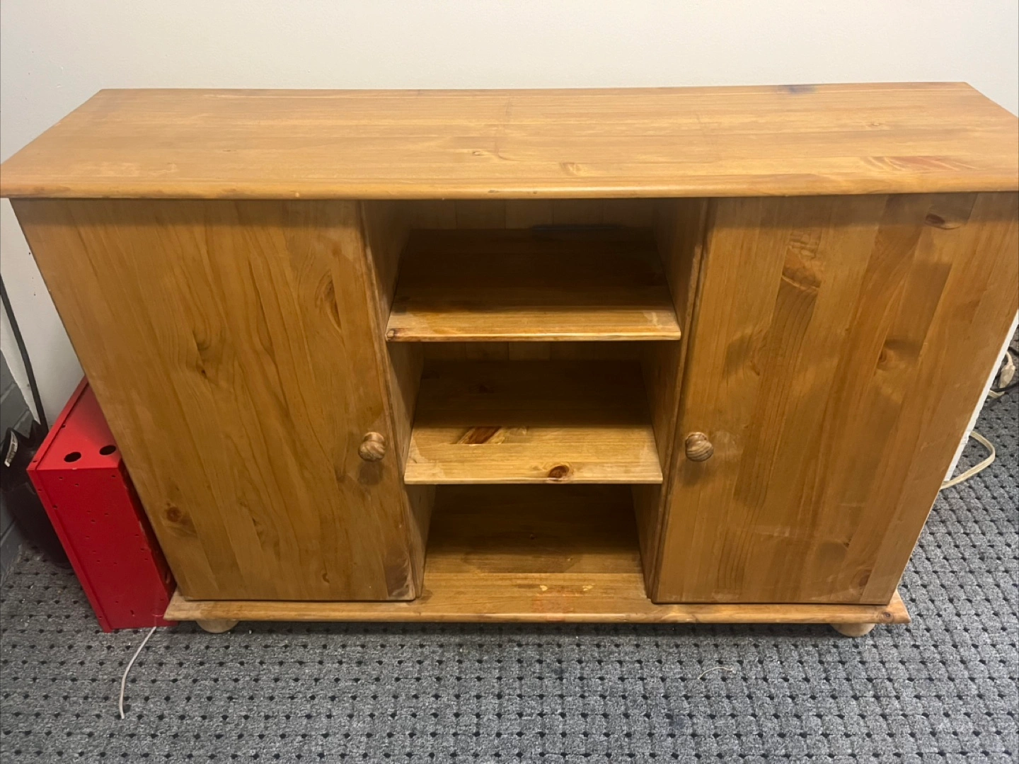 Selling a wooden cabinet with shelves. It's in good condition and perfect for extra storage in any room of your house. It features two doors and open shelving in the middle, providing versatile storage options