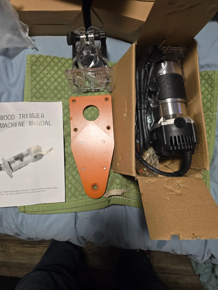 Selling a wood trimmer machine that comes with its original box and manual. It appears to be in good condition and ready for your woodworking projects!