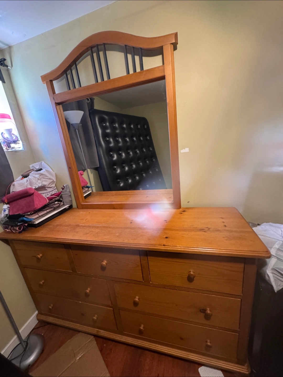 Selling a solid wooden dresser with mirror and a matching nightstand for just Free