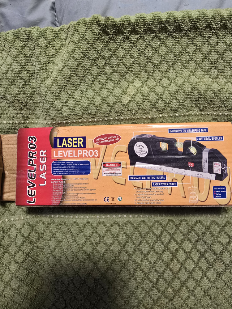 Selling a Laser LevelPro3, still in its original packaging! It comes with an 8-foot/250 cm measuring tape and features two-way level bubbles. The product also contains 3 AG13 batteries for free. It also has standard and metric rulers