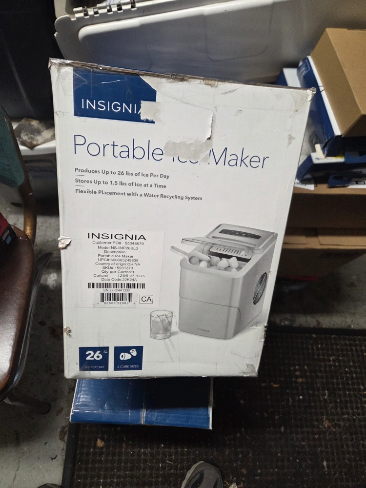 45Selling an Insignia portable ice maker, model NS-IMP26SL0! It produces up to 26 lbs of ice per day and stores up to 1.5 lbs of ice at a time. It also features flexible placement with a water recycling system. User pamphlet included. Two(2) units left.