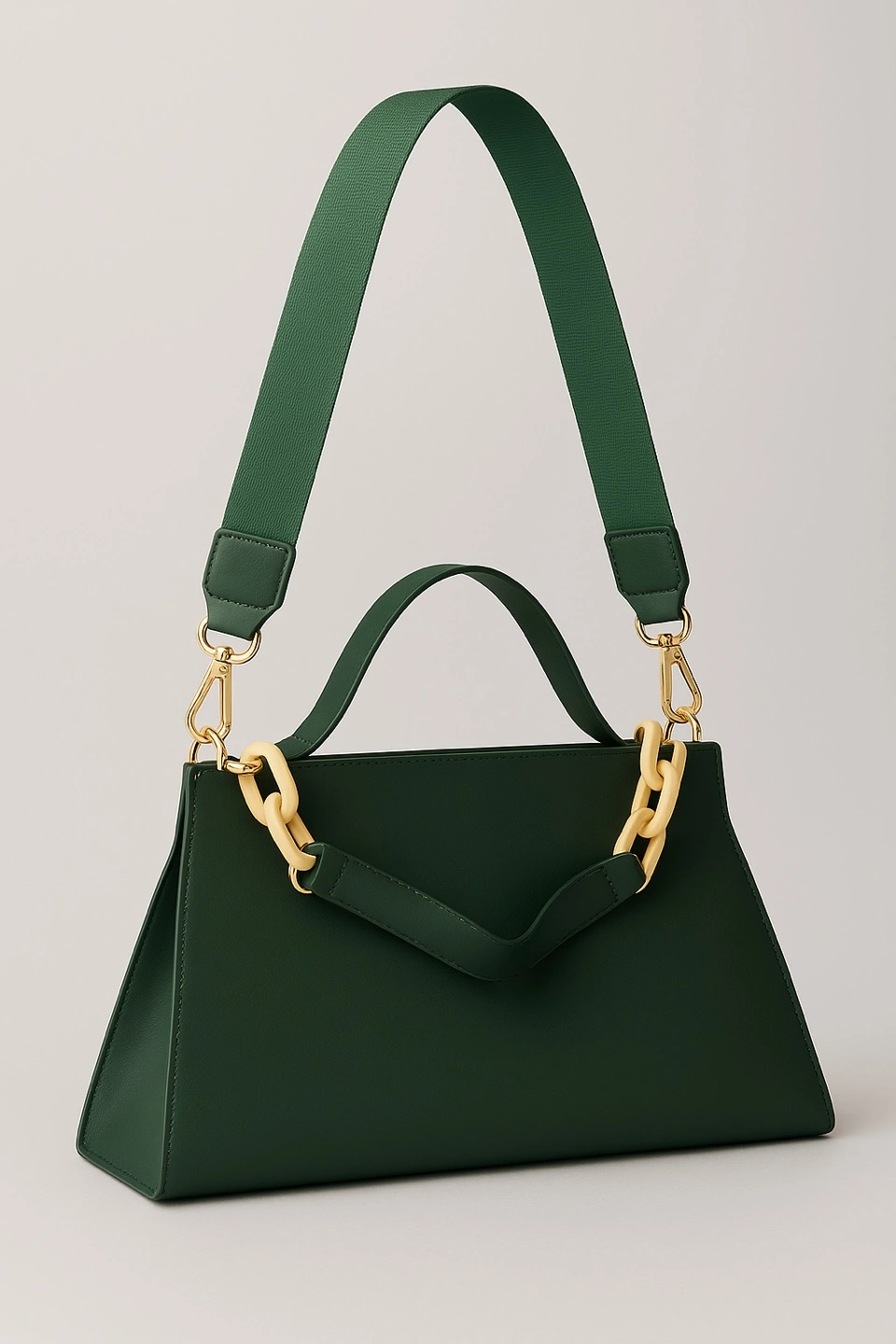 Stylish green trapezoid-shaped shoulder bag with a unique design. The bag features a sturdy shoulder strap and a decorative chain detail. Perfect for adding a touch of sophistication to any outfit!