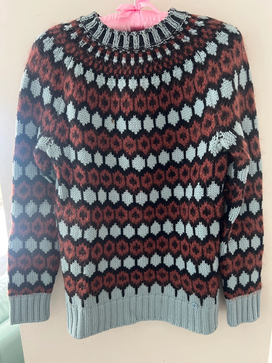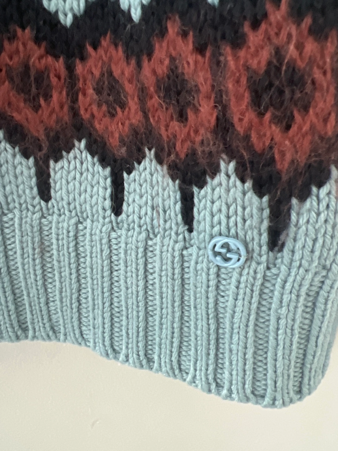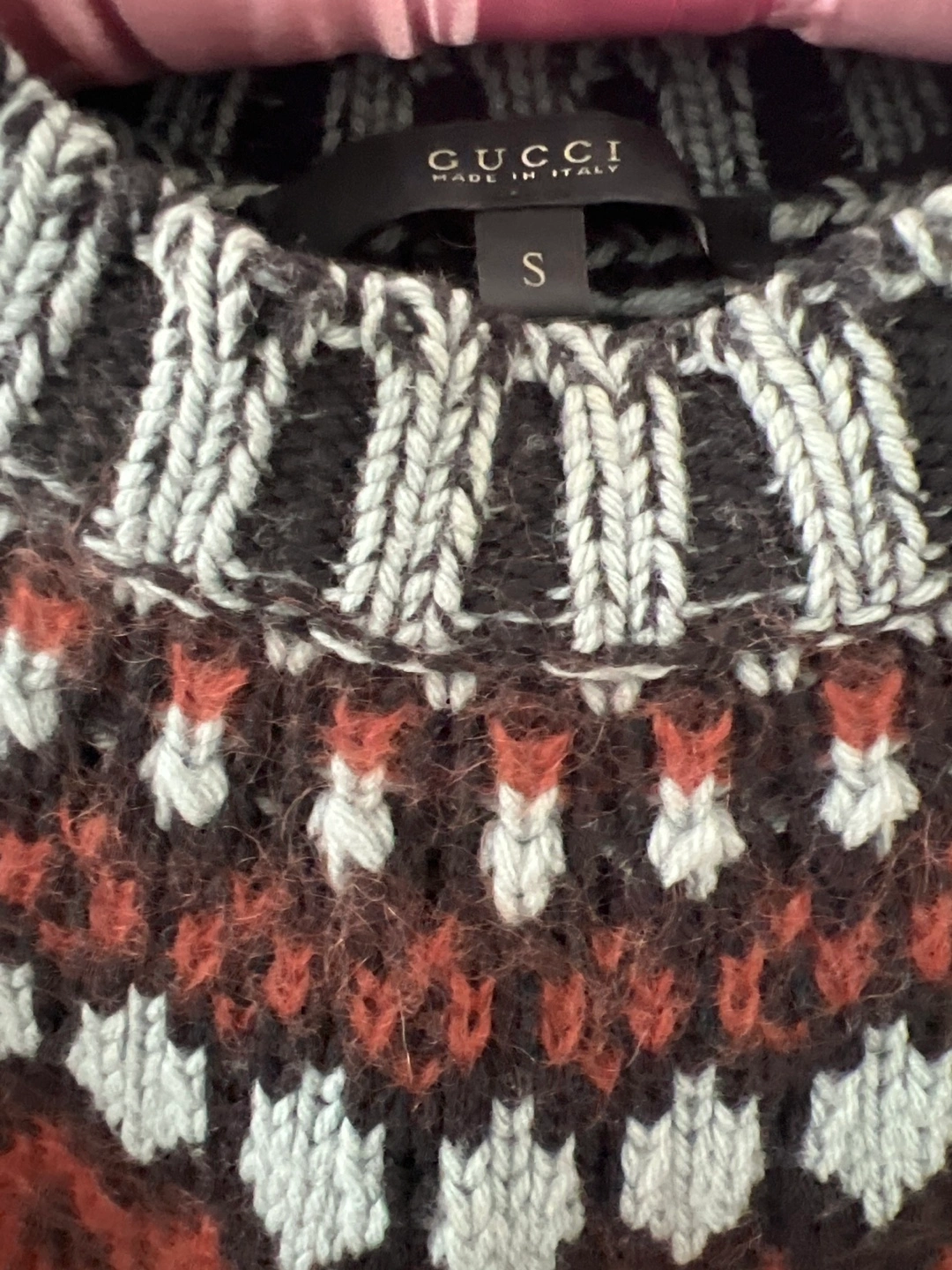 Cozy Gucci sweater in a wool blend! Features a unique pattern with brown, light blue, and black colours. Size is small.