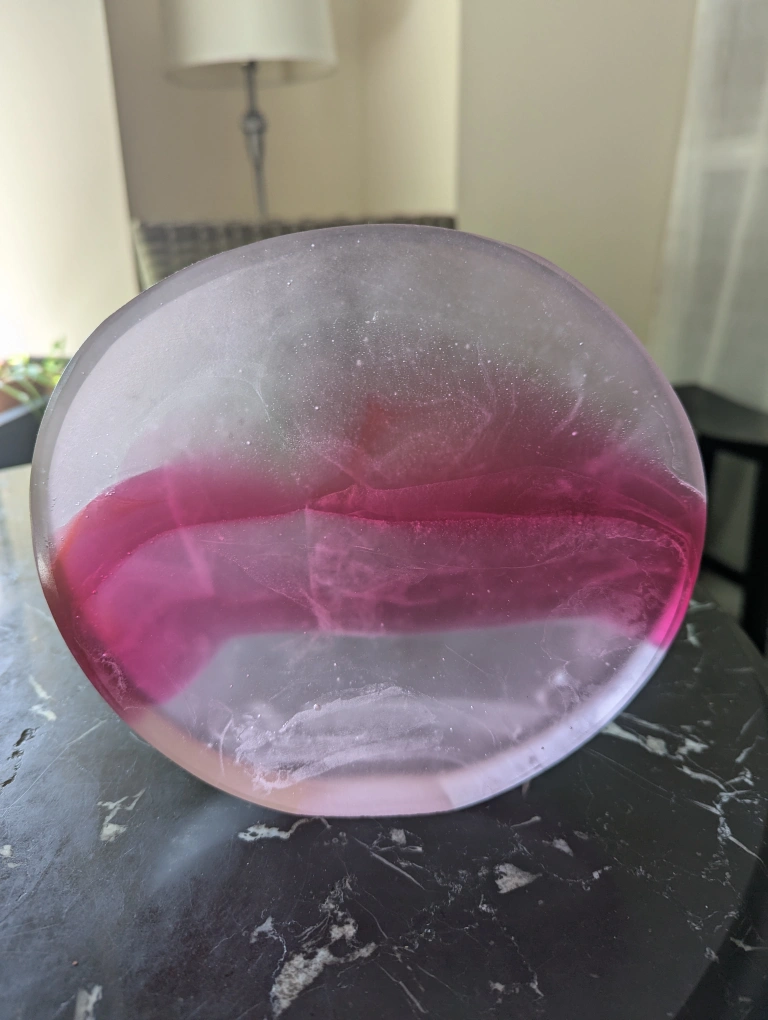 Two beautiful decorative glassware pieces, one is small and round with shades of pink, the other is tall with shades of brown. Both in excellent condition. Sold separately but also available as a pair.