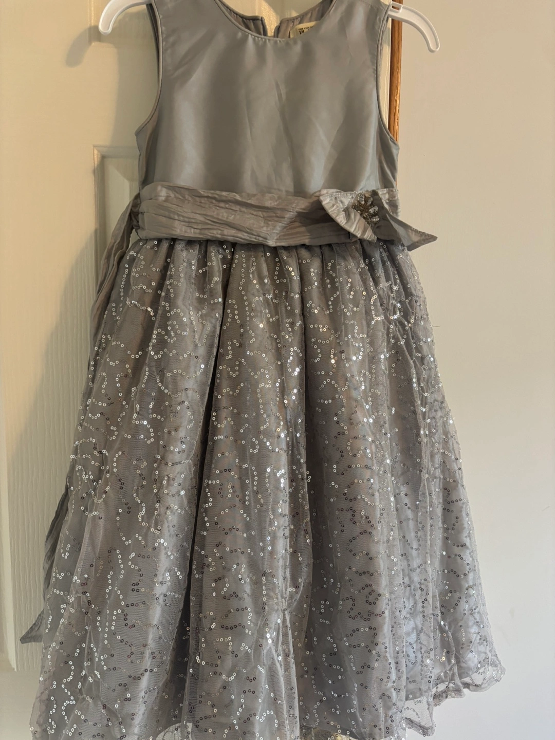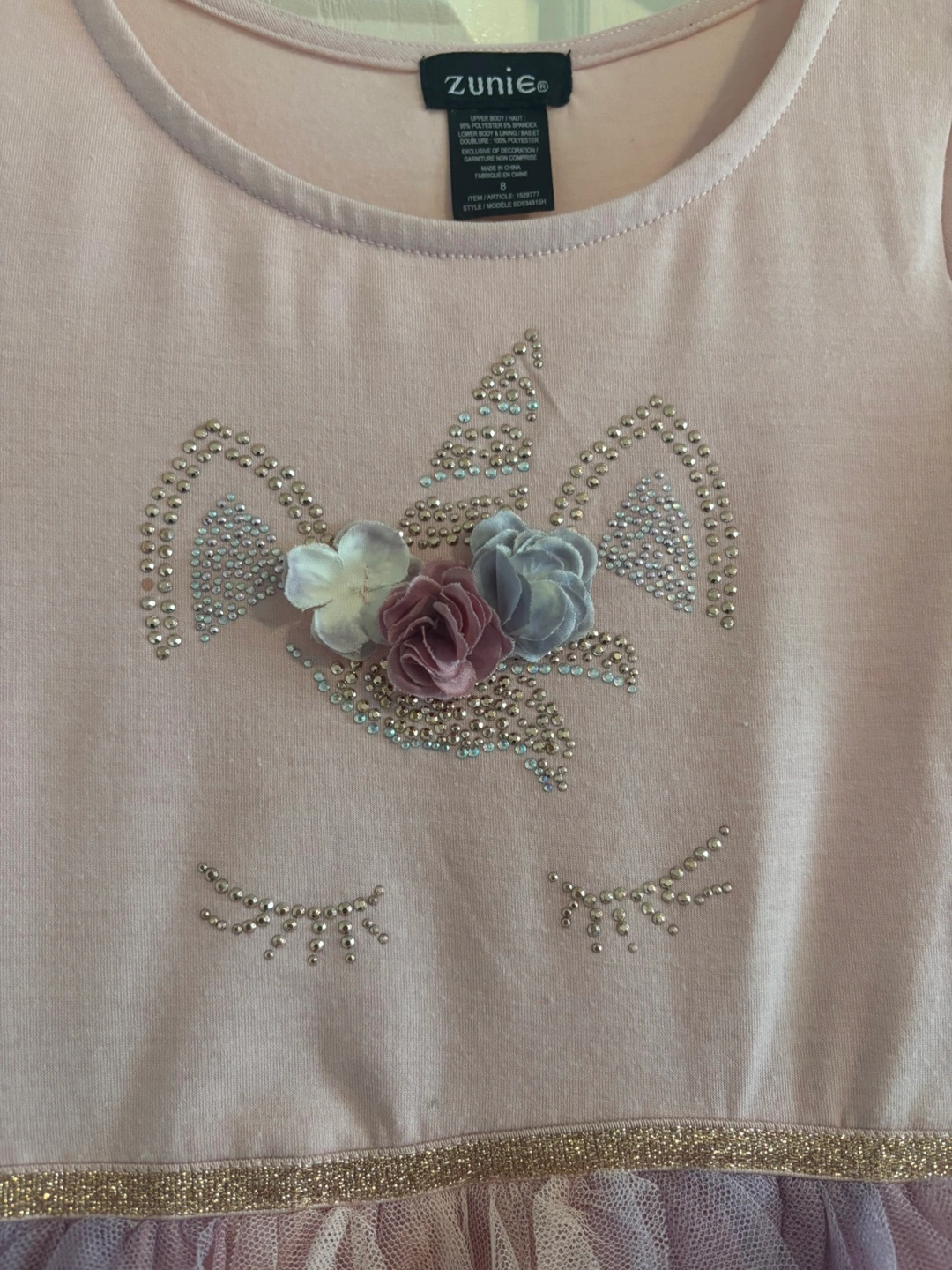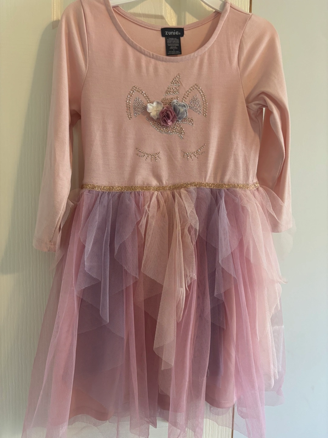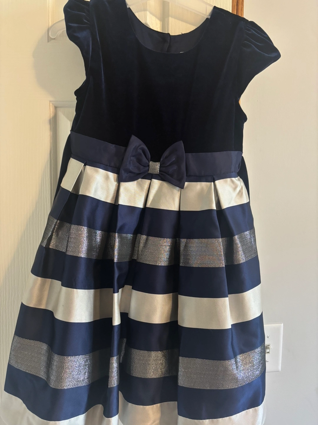Selling a few adorable dresses for girls! There's a Zunie dress with a cute unicorn design, and two other dresses, one in navy and white stripes and another in ivory with sequins. Perfect for parties or special occasions! Each is $8.