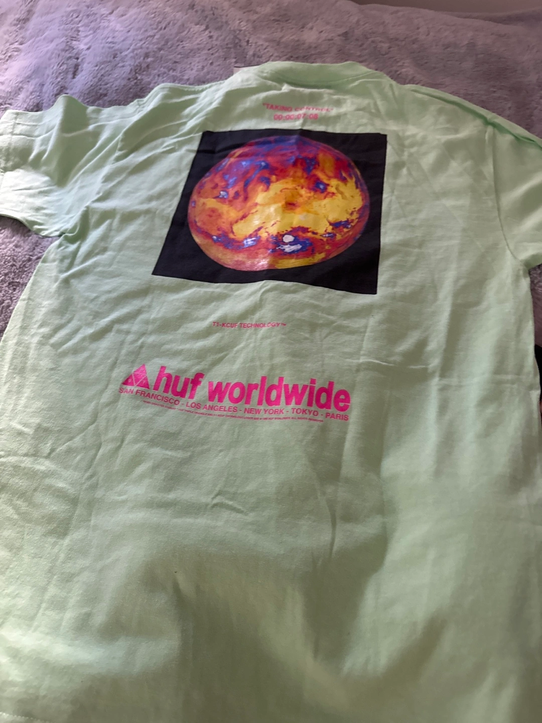 Selling a HUF Worldwide graphic t-shirt in a refreshing mint green colour! The shirt features a cool planet graphic on the back and the HUF logo on the front. It's in great condition and ready for a new home. Perfect for adding a touch of streetwear to your wardrobe!