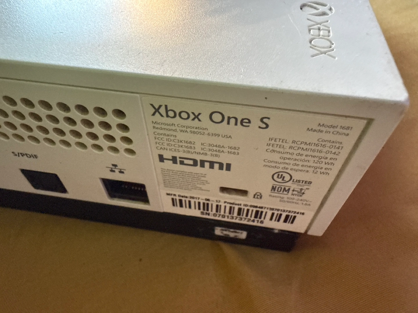Selling a used Xbox One S console in white. The console is in good condition and comes with a controller. It's ready for gaming!