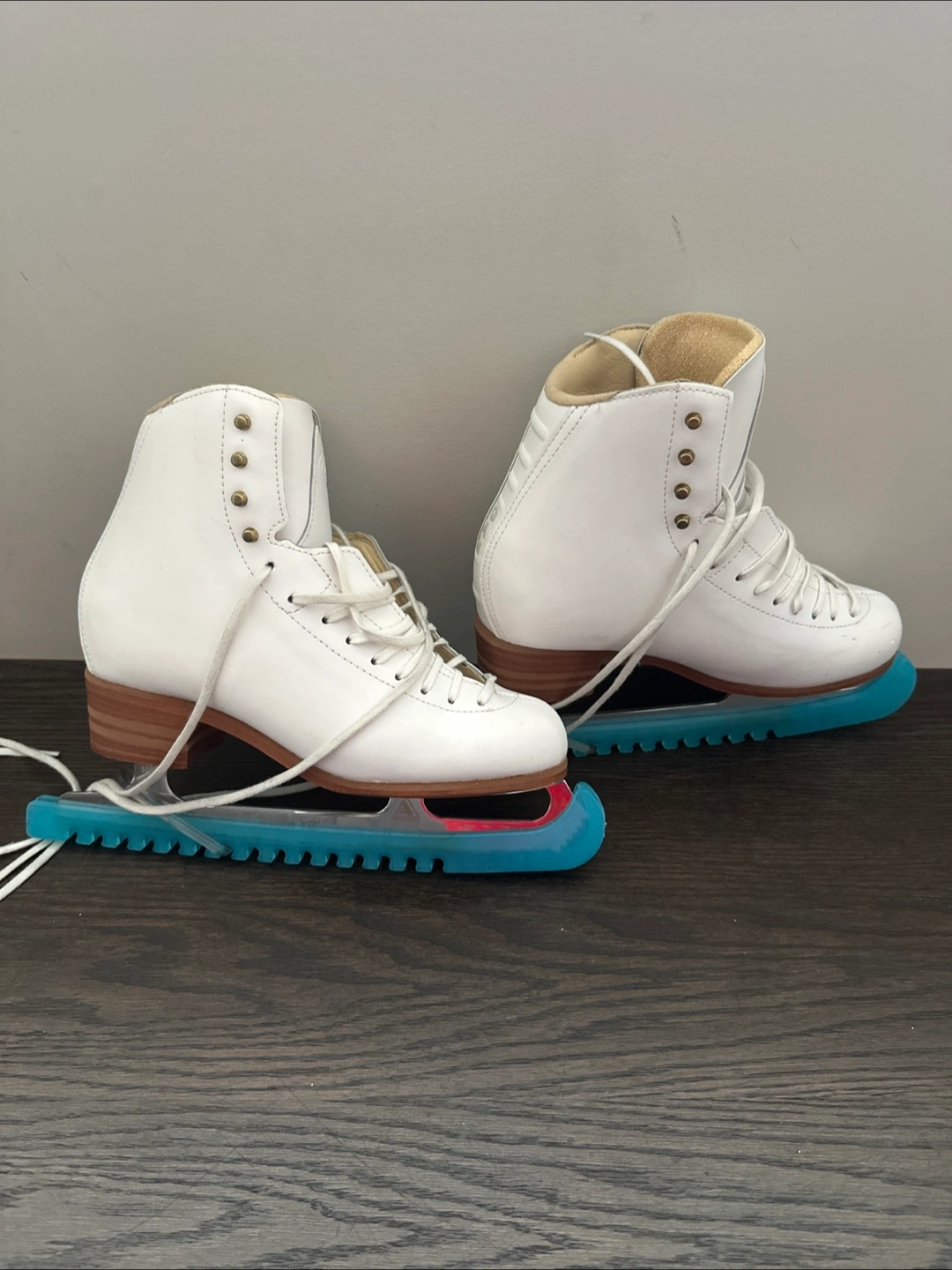 Selling a pair of ladies GAM ice skates in size 10C. They are white with a blue blade cover. Comes with a Sol-Tec bag for easy carrying