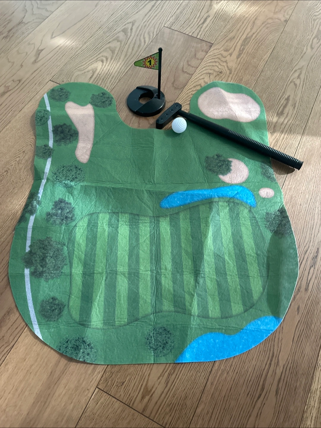 Fun golf play set for kids! Includes a putting green mat, golf club, ball, flag, and tee. Great for indoor or outdoor play to develop hand-eye coordination and motor skills