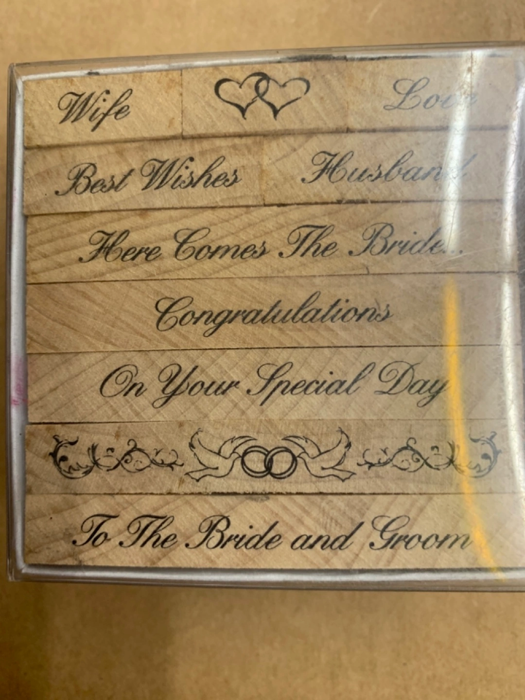 I'm selling an Inkadinakdo Wedding Bliss Peg Stamp Set. It contains 10 stamps on wood blocks. Great for cards, scrapbooks, and many more craft projects!