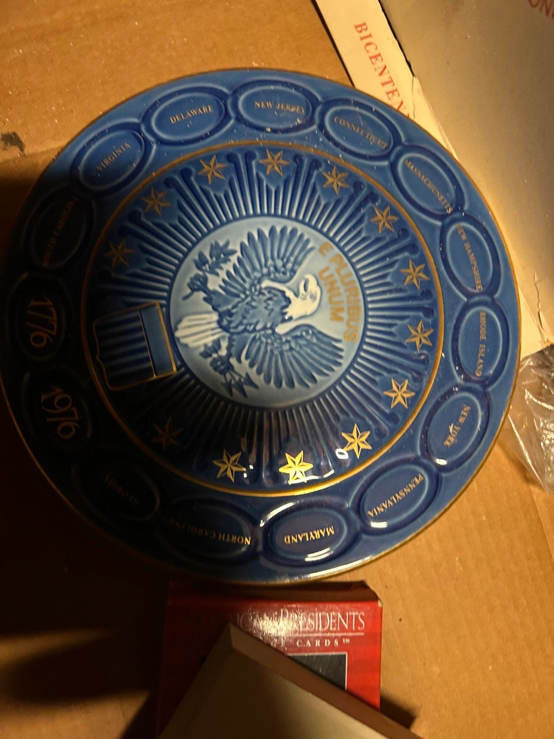 Selling a Royal Grafton Bicentennial Plate commemorating the United States Bicentennial. The plate features a blue and gold design with an eagle emblem and the inscription 'E Pluribus Unum'. It's a special edition plate produced to celebrate the Bicentennial of the United States of America