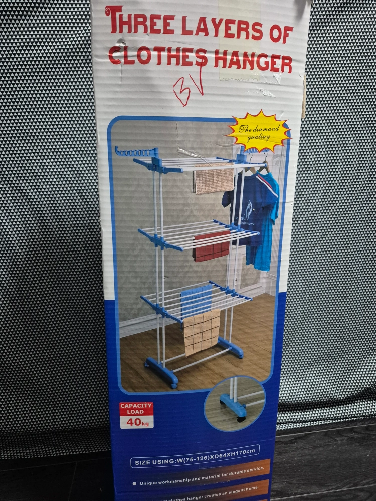 Selling still-in-box three-layer clothes hanger! It's perfect for maximizing space and keeping your clothes organized. Load capacity up to 40kg. Size using: W(75-126)XD64XH170cm