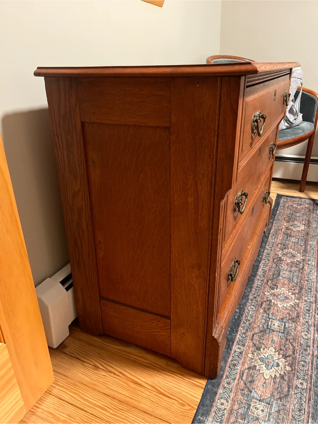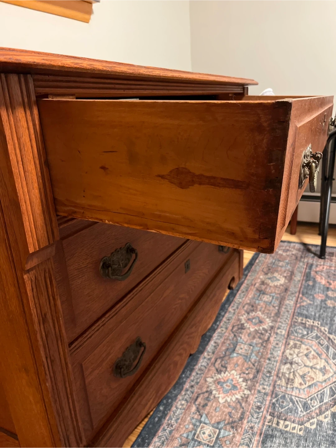 This is a beautiful antique chest with three drawers. It's made of solid oak wood with ornate brass pulls. The wood has a warm, rich finish. It's perfect for storage in any room! Measurements: 43 1/8” width, 17 7/8 depth, 30 7/8 height