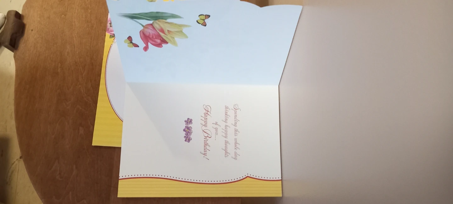 A lovely birthday card featuring a colourful floral arrangement with tulips and butterflies. The inside of the card has a sweet message for the recipient's special day. Spending this whole day thinking happy thoughts of you...