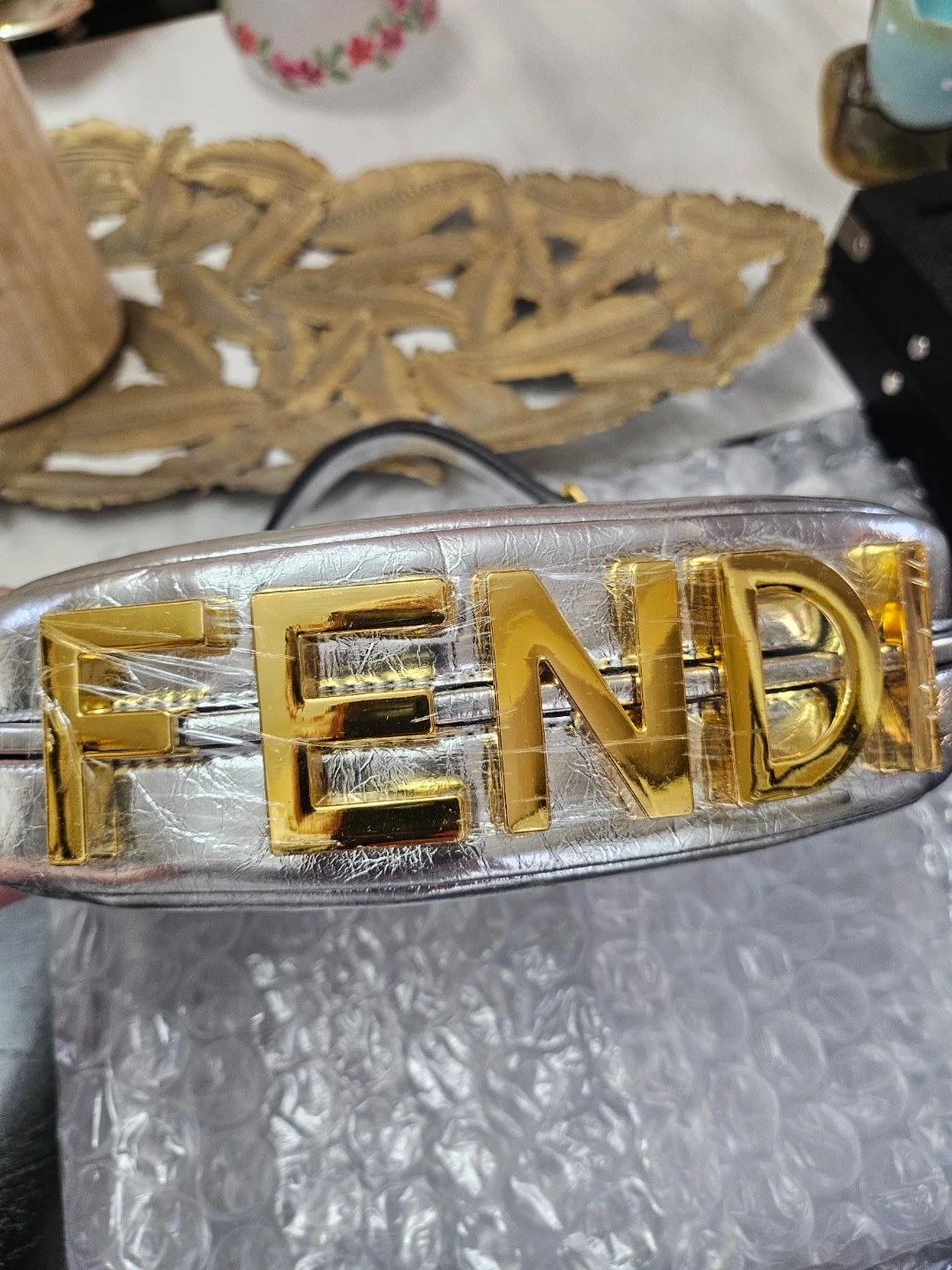 Elevate your style with this stunning Fendi purse. Featuring a sleek silver design with bold gold accents, it's perfect for adding a touch of luxury to any outfit. Brand new, never used, authentic with included strap belt, the gold Fendi mark is still wrapped in the original plastic ๐. Made in italy ๐ฎ๐น.