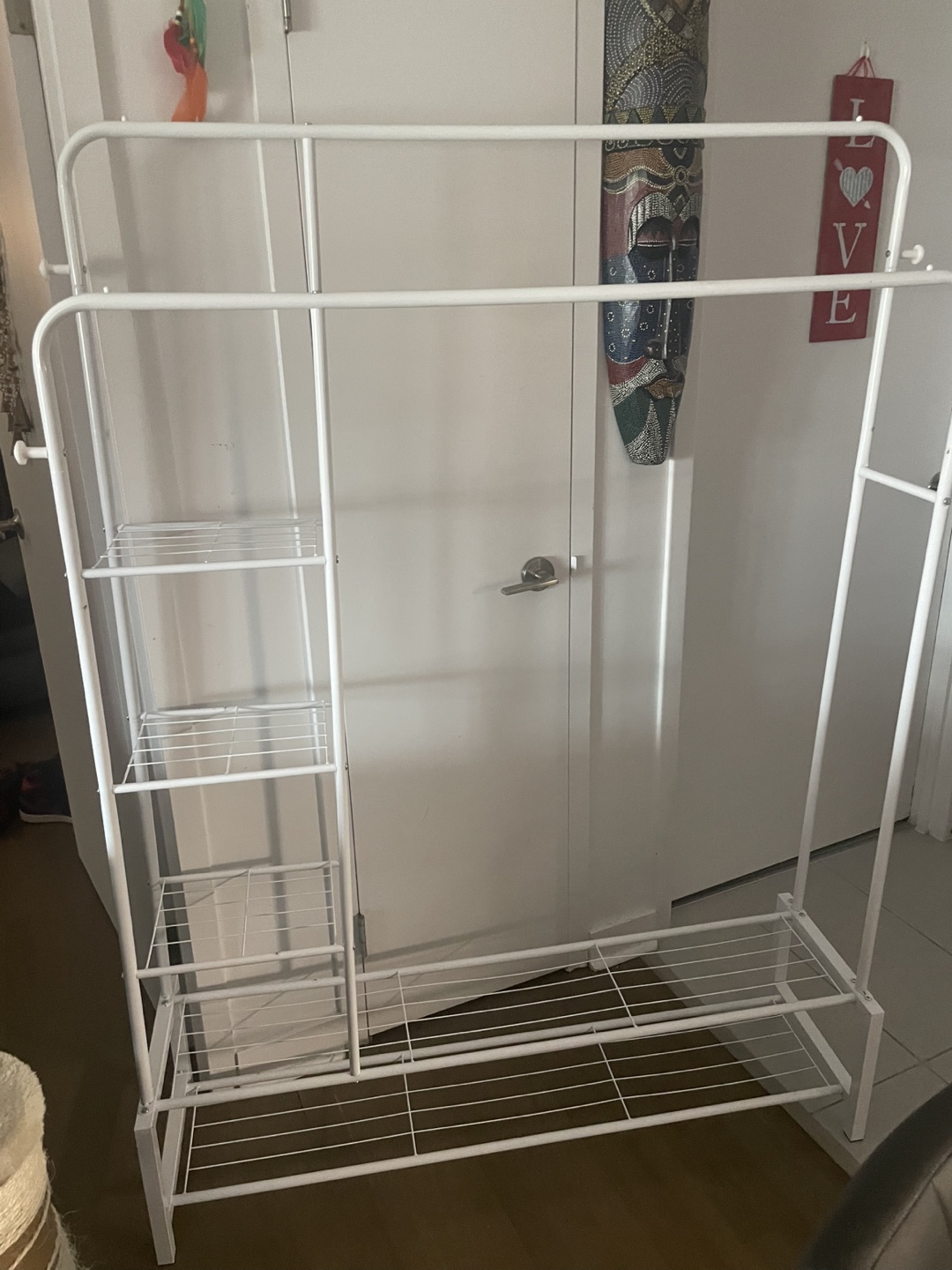 Selling a handy white metal clothes rack! It comes with shelves on one side and at the bottom, offering lots of storage space for your clothes and accessories. Perfect for keeping your wardrobe organized!
