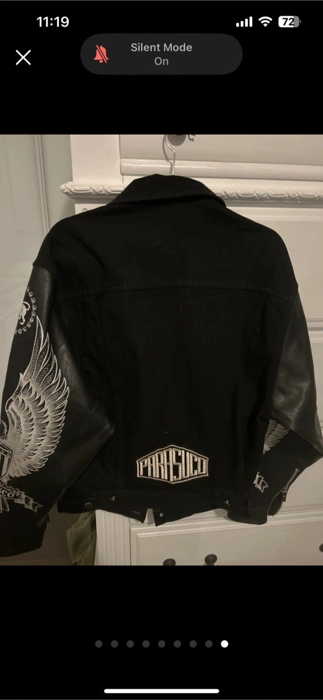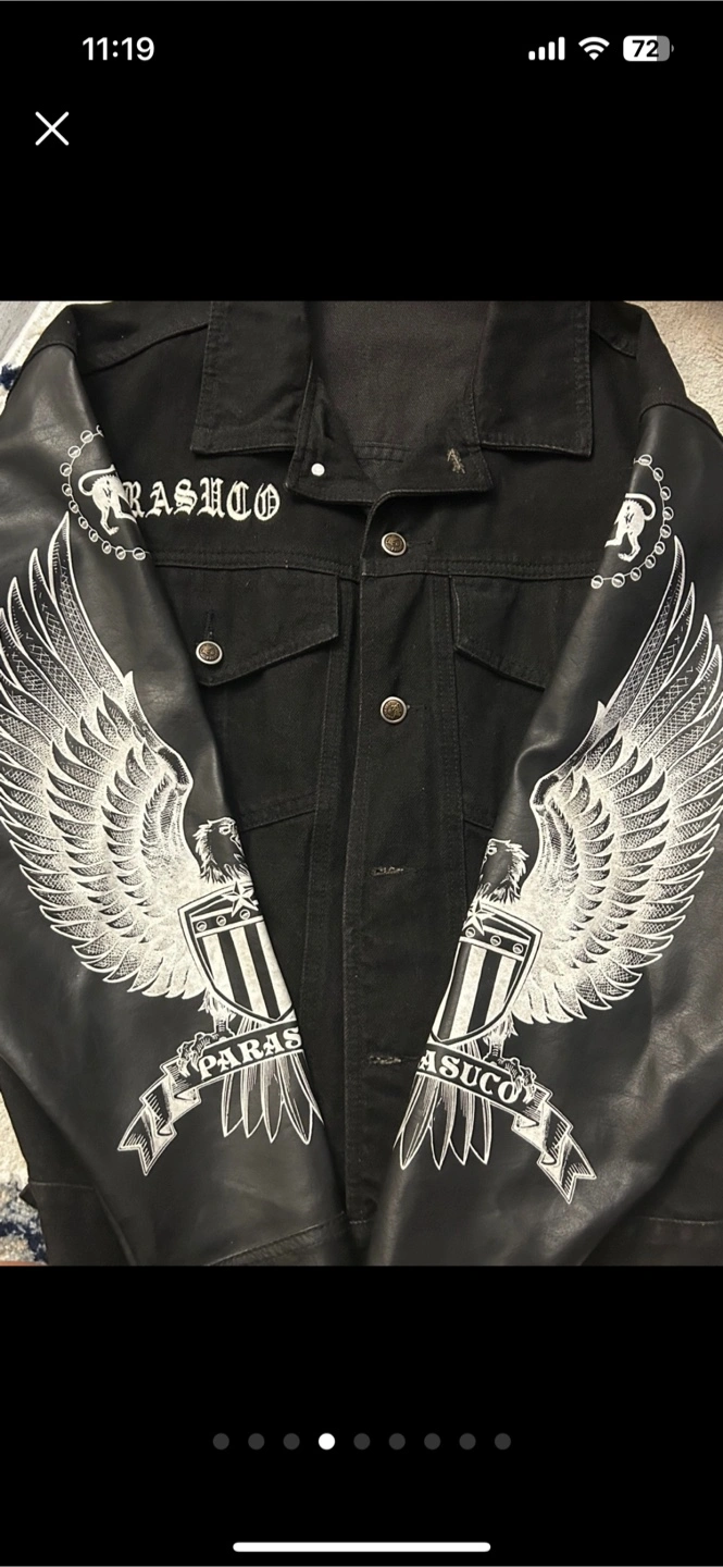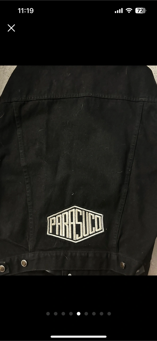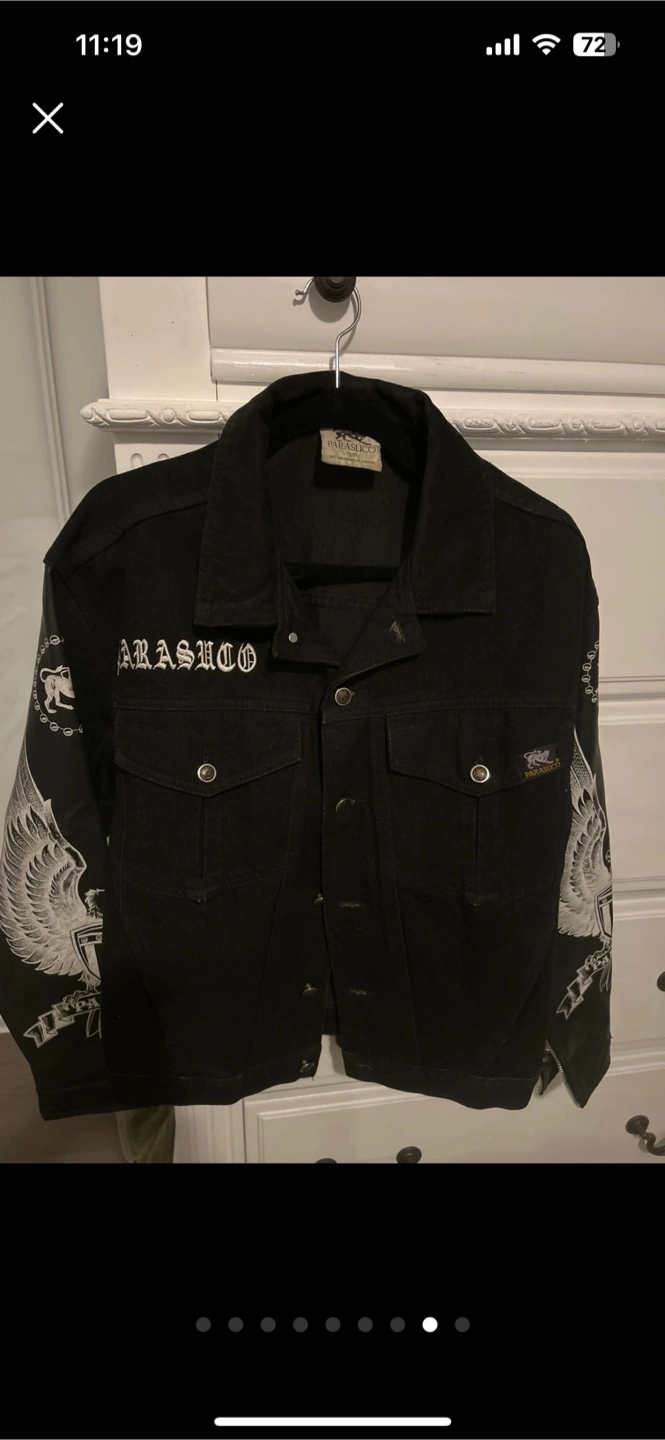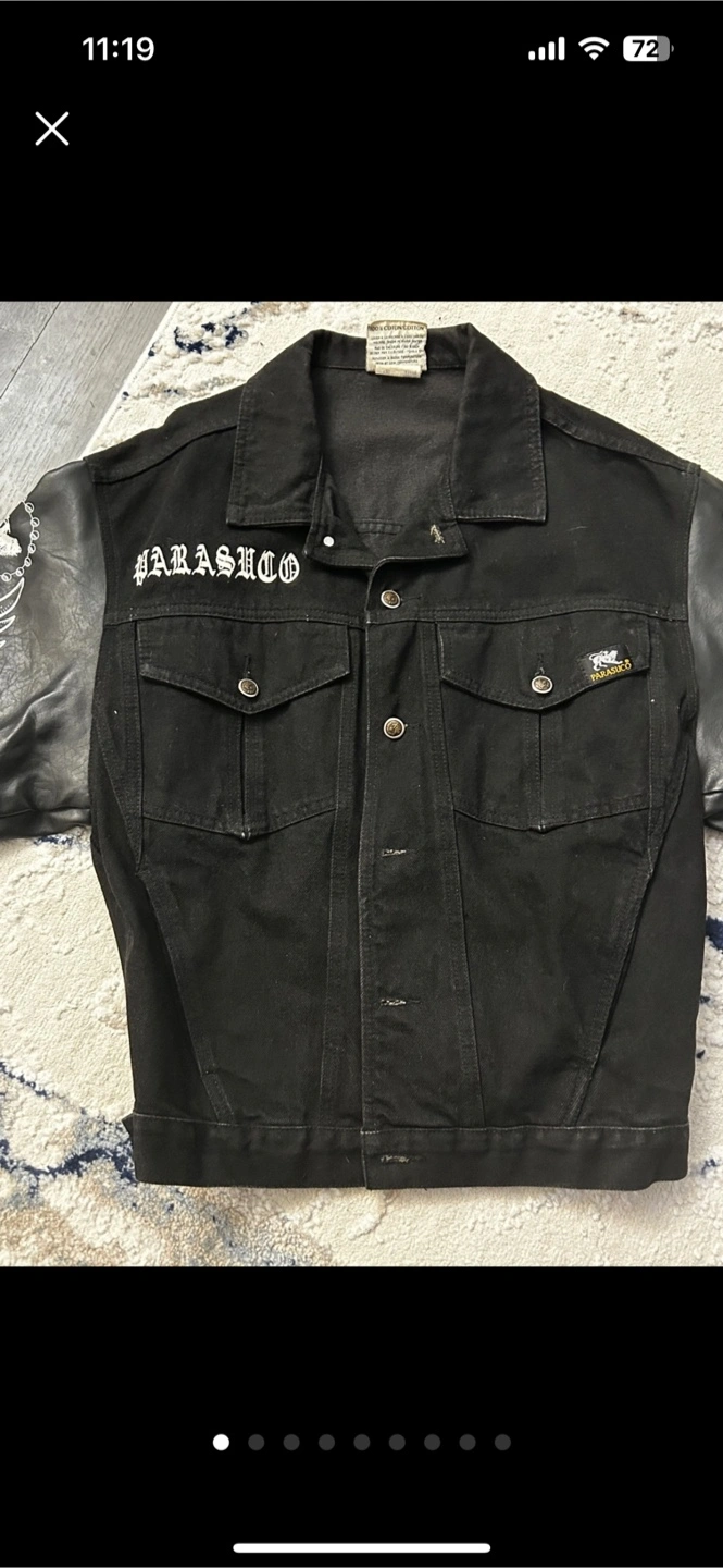 414black denim biker jacket from Parasuco. It has a unique design with printed sleeves and the brand name on the back. It's in good condition and ready for a new home! Serious Inquiries only!!
