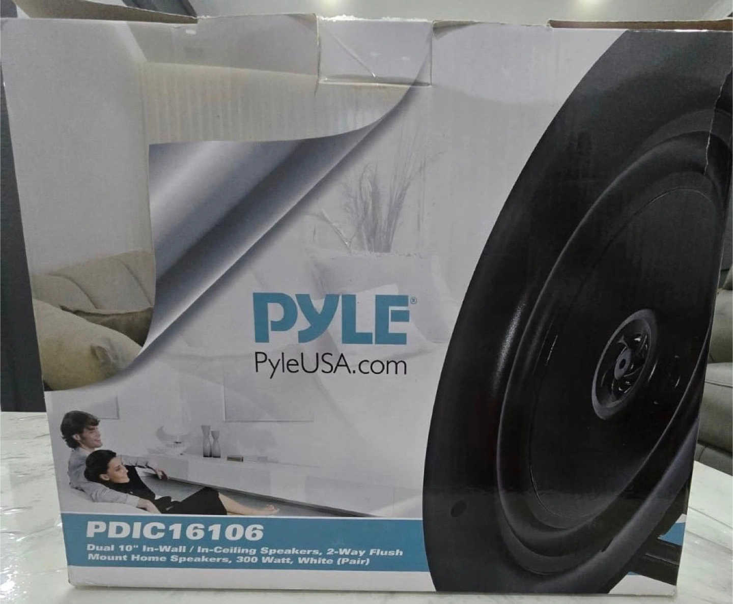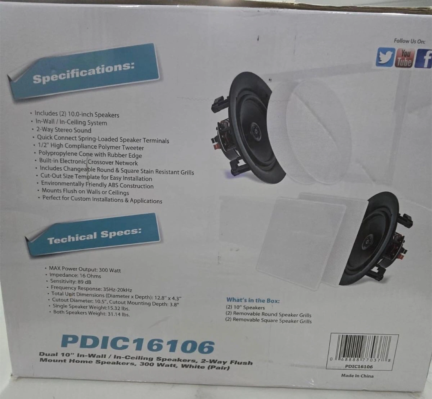 Selling a pair of Pyle PDIC16106 dual 10-inch in-wall/in-ceiling speakers. These are 2-way flush mount home speakers with 300 watts of power. They come with a quick connect spring-loaded speaker terminal and a polypropylene cone with a rubber edge. The box includes:
