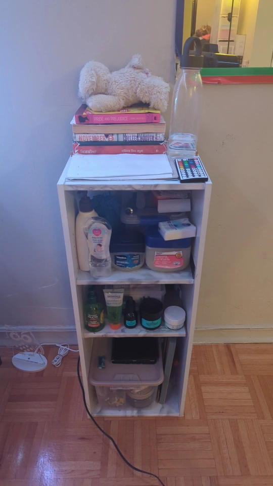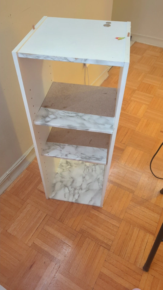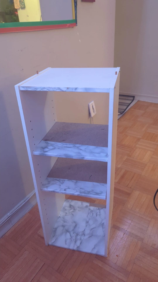 Selling a white shelving unit that's perfect for adding some extra storage to any room! It features marble accents on the shelves, giving it a stylish touch. It's in good condition and ready for a new home.