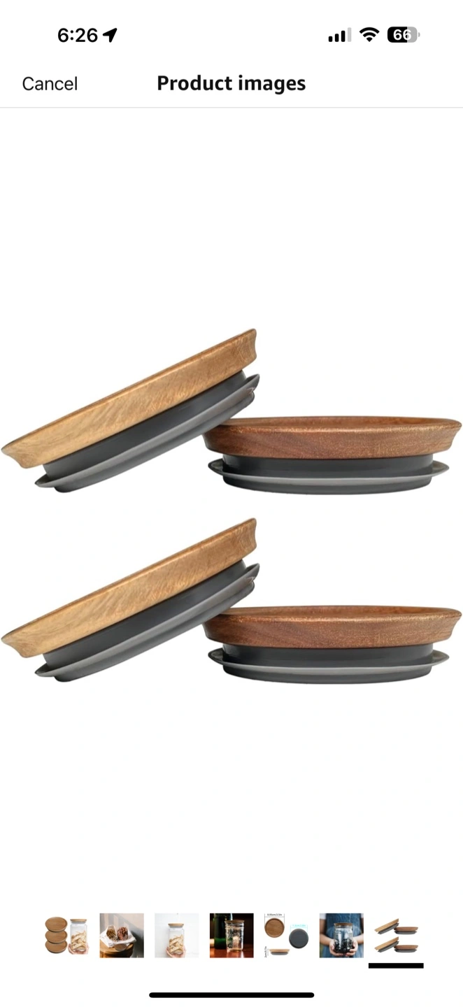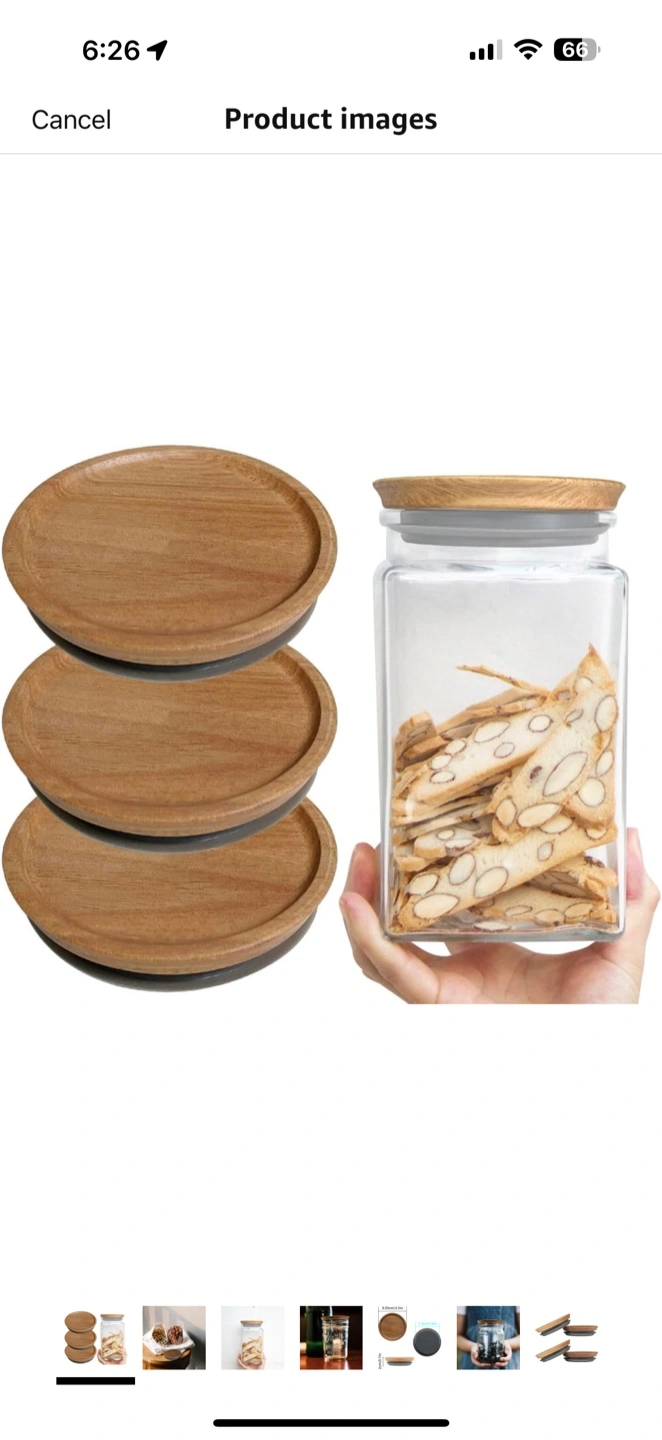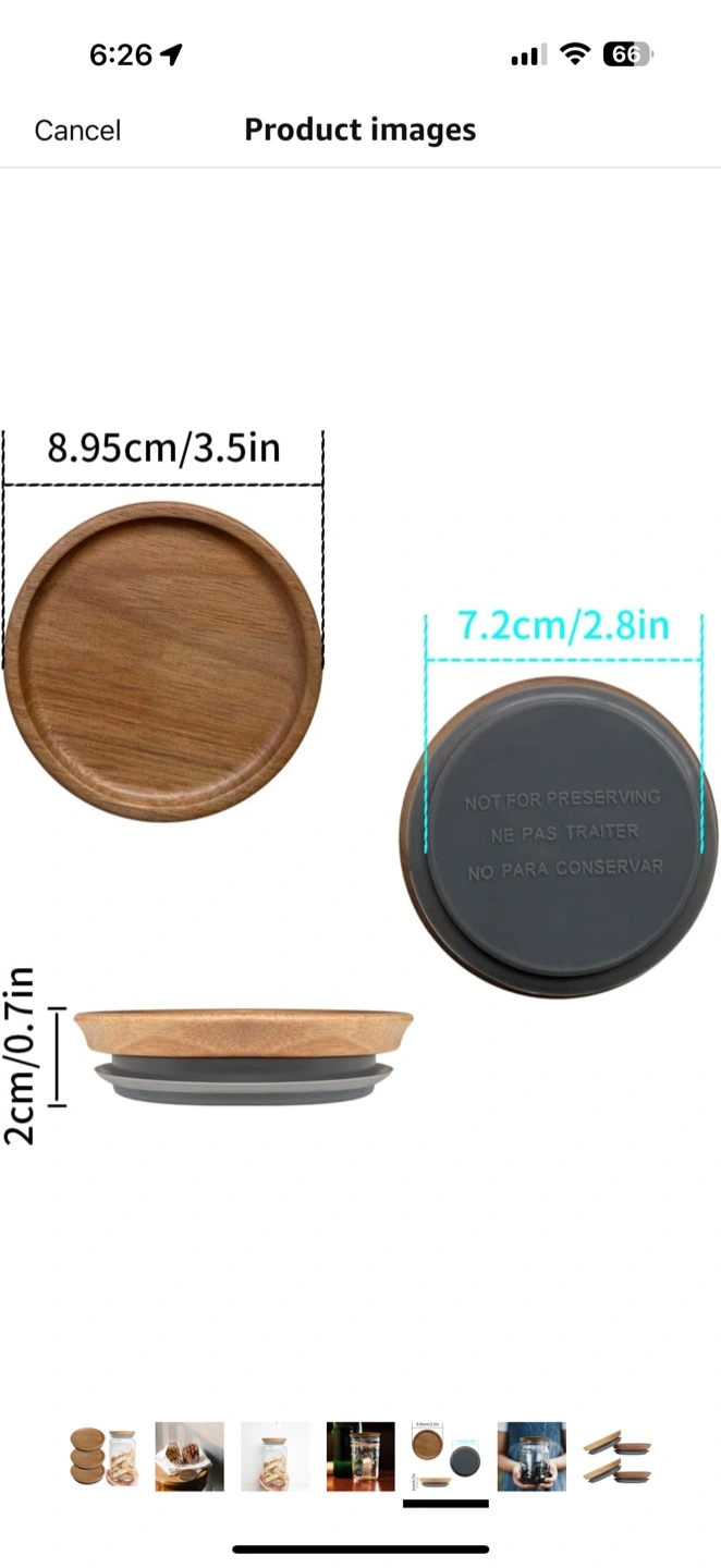 I'm selling a Homin self-sealing mason jar. The jar has a wooden lid. The lid is 8.95cm/3.5in in diameter and 2cm/0.7in tall. It's great for storing nuts, cookies, or anything else you want to keep fresh!